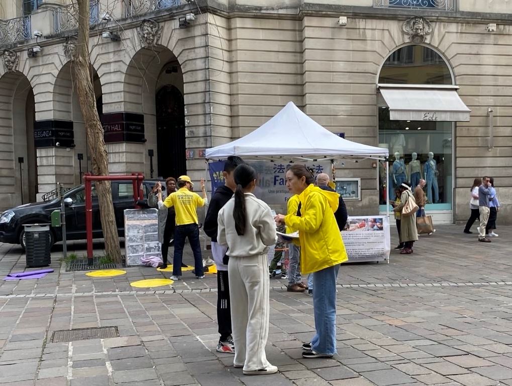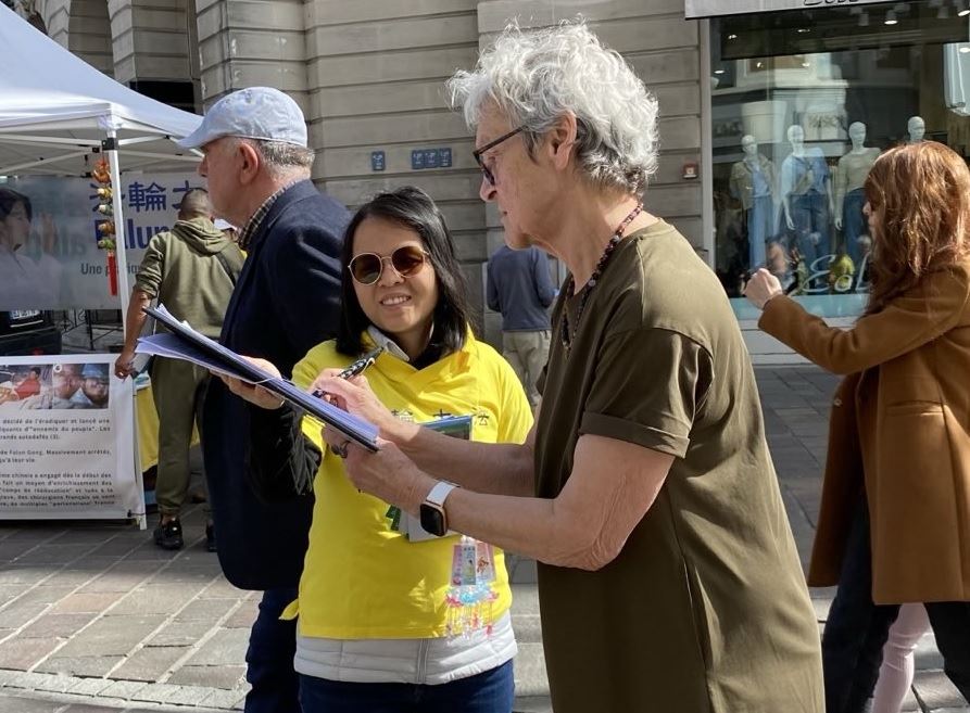 二零二五年三月二十二日,当地的讲真相活动地点在步行区的起始处,靠近电车路线,旁边是年轻门(Porte Jeune)商场和欧洲塔。刚到达时,学员就开始播放法轮功音乐,一位女士对美妙、舒缓和谐的音乐表示感谢:“谢谢,继续这样做,太棒了!”