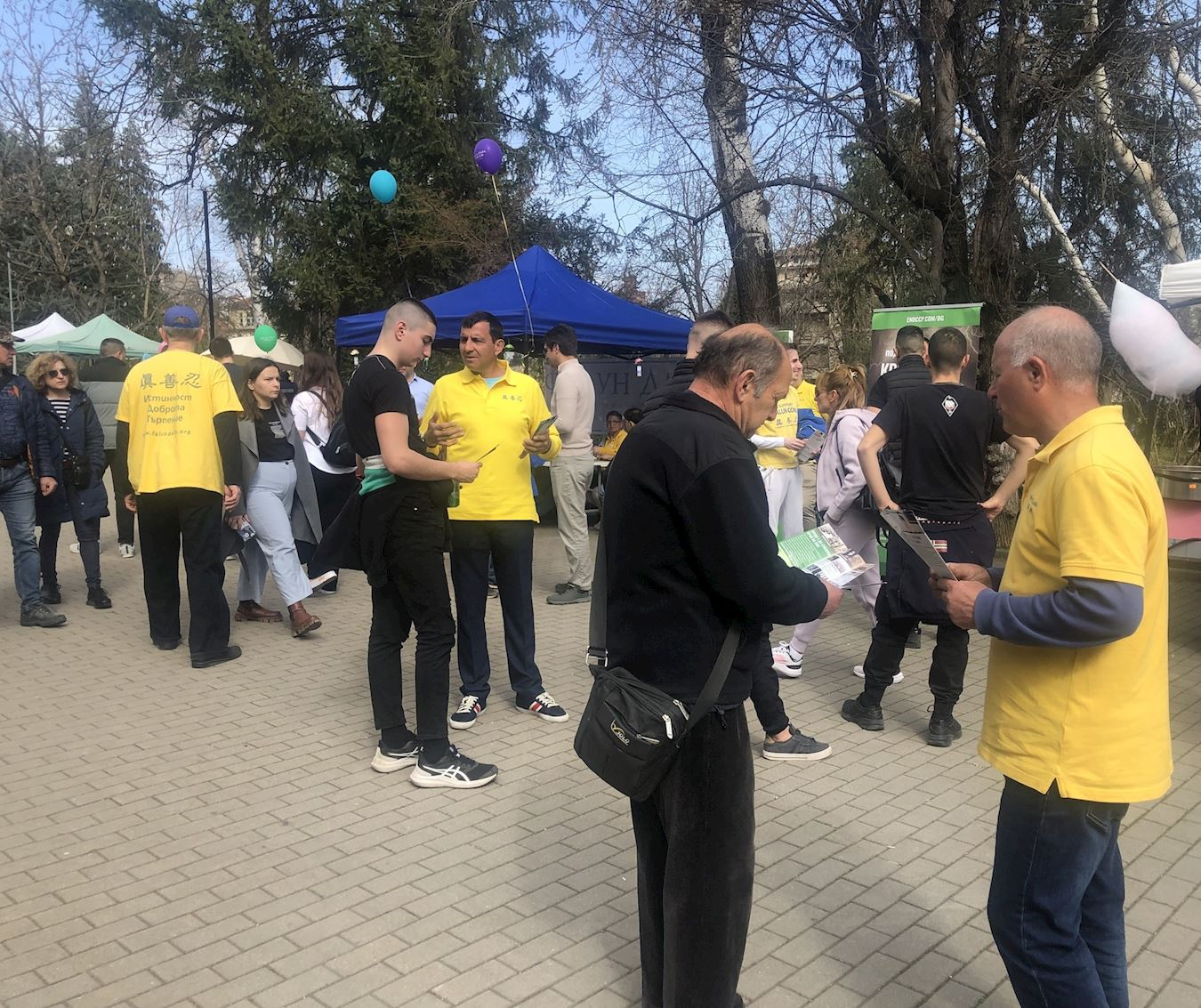 法轮功学员的信息台位于市中心马尔诺波尔公园(Marno Pole)的主步道两侧,这里是市民休闲娱乐的热门场所。当天天气温暖晴朗,学员向路人分发传单、演示功法,并讲述中共对法轮功长达二十六年的迫害。人们在活动中签署两份请愿书:一份是反对中共迫害法轮功,另一份是呼吁政府阻止保加利亚的实体参与中共针对法轮功学员的强摘器官的罪行。