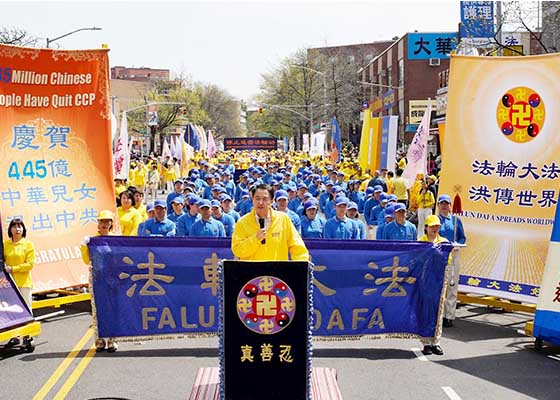 四月十九日,继纪念“四·二五”和平上访盛大游行之后,浩浩荡荡的队伍接着开始了盛大集会,以纪念中国万名法轮功学员和平上访26周年。