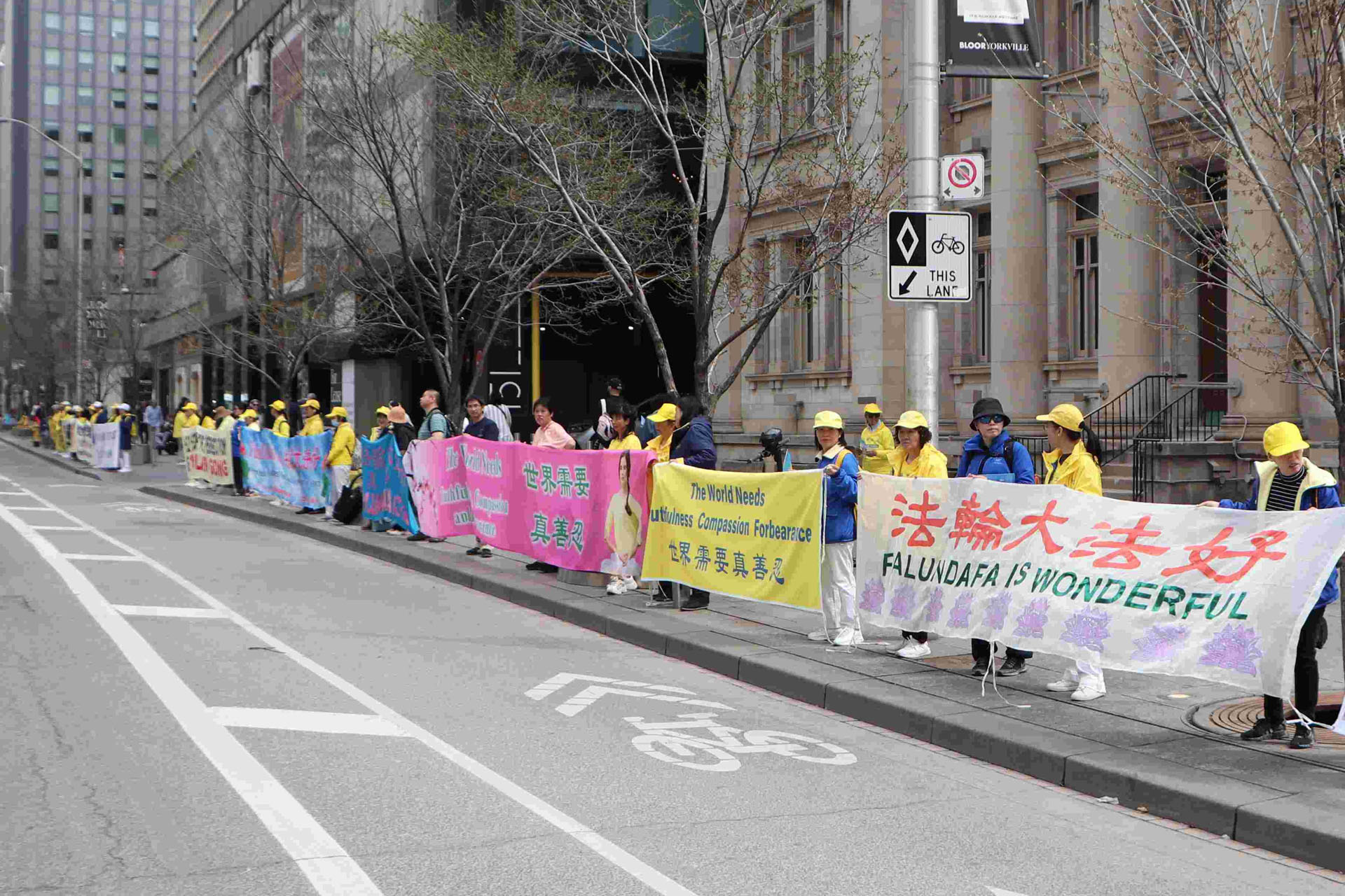图1~3:下午一点至三点,法轮功学员在安省皇家博物馆的十字路口拉起真相长城