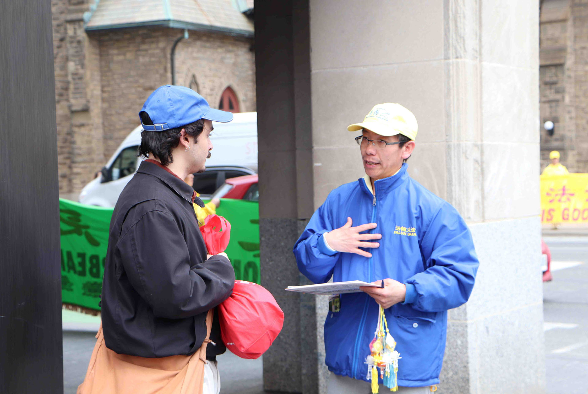 二零二五年四月二十四日,为纪念“四·二五”和平上访二十六周年,加拿大多伦多法轮功学员举行了多项活动。一早,学员们在皇后公园的草坪上集体炼了五套功法。之后,在皇后公园举行了大型集会。下午,学员们又到市中心的繁忙路口,拉起一条条横幅,向各界世人传递真相,揭露中共对法轮功的迫害。有人签名支持法轮功反迫害;有人听完真相后,谴责中共欺压良善;还有华人当场声明退出中共的党、团、队组织。