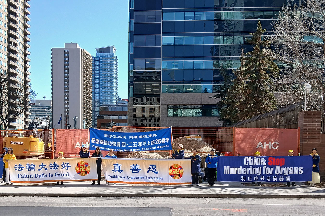 当天,卡城法轮功学员如同二十六年前中国的法轮功学员一样,和平安静地伫立在人行道上,手持横幅,“纪念四‧二五法轮功学员和平上访26周年”“法轮大法好”“真善忍”“停止迫害法轮功”“制止中共活摘器官”等标语,向路过的行人及车辆司机传递法轮大法的美好,同时揭露中共迫害法轮功学员的真实情况。