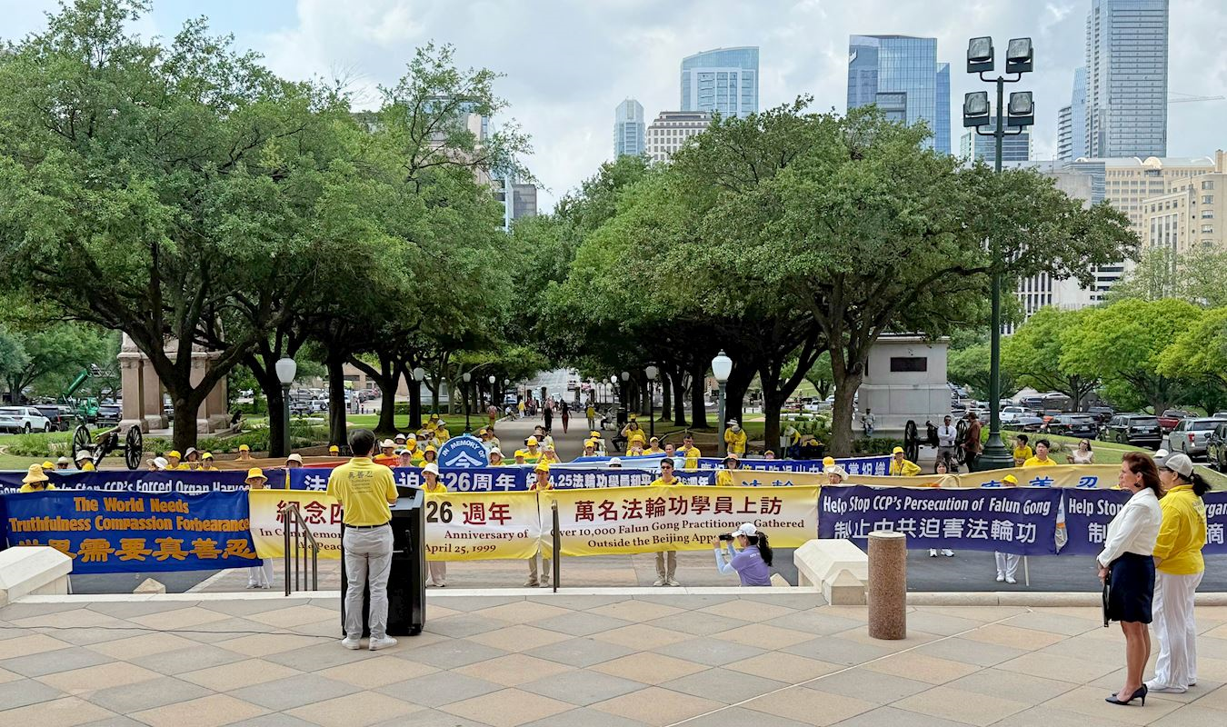 活动主办方美南法轮大法学会会长肖恩∙杨(Sean Yang)首先发言,他指出法轮功学员一九九九年四‧二五的和平上访,却遭中共后来残酷的迫害。在这长达二十六年的迫害中,数以万计的法轮功学员在中共的看守所或劳教所中被迫害致死,连许多年逾八旬的老年学员也未能幸免入狱。更令人震惊的是,法轮功学员是在中国大陆活摘器官罪行的主要受害群体。