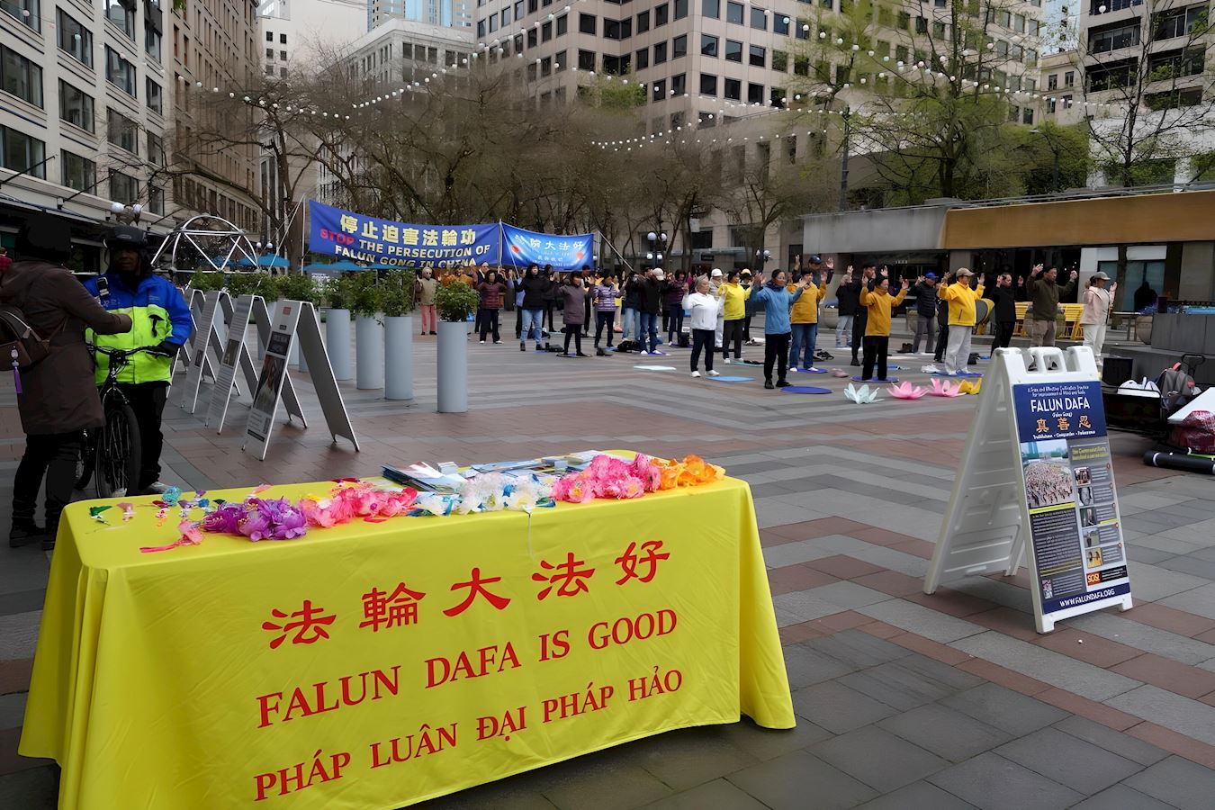 当天,法轮功学员在公园的广场上展示法轮功的五套功法,在喧嚣的西雅图市中心构成一道独特的风景线。许多路人好奇地驻足观看,有的人和法轮功学员交谈,有的人仔细阅读学员们在旁边放置的法轮功真相展板。