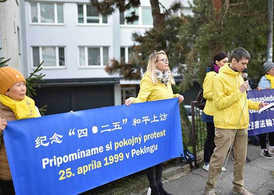 四月二十四日,斯洛伐克法轮功学员聚集在布拉迪斯拉伐的中共驻斯洛伐克大使馆前,纪念二十六年前在北京发生的“四・二五”和平上访。