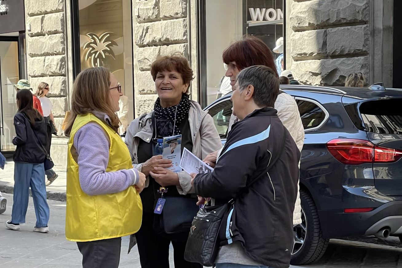 图1~5:四月二十五日,法轮功学员在文艺复兴历史名城佛罗伦萨(Firenze)市中心的圣玛利亚(Santa Maria)教堂广场,举行纪念四·二五法轮功和平上访二十六周年活动,广受人们的喜爱。