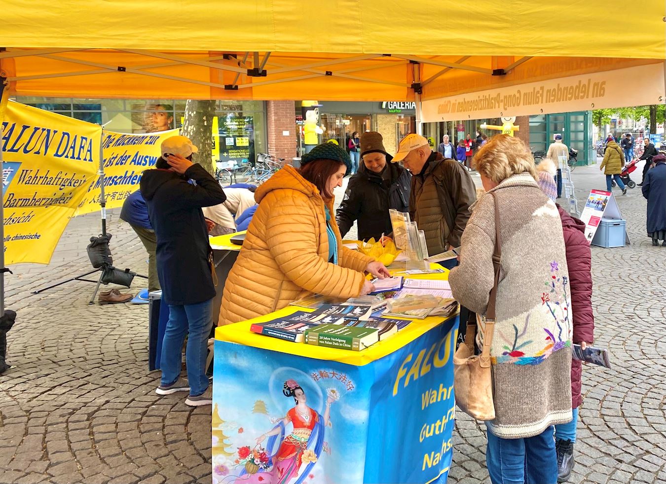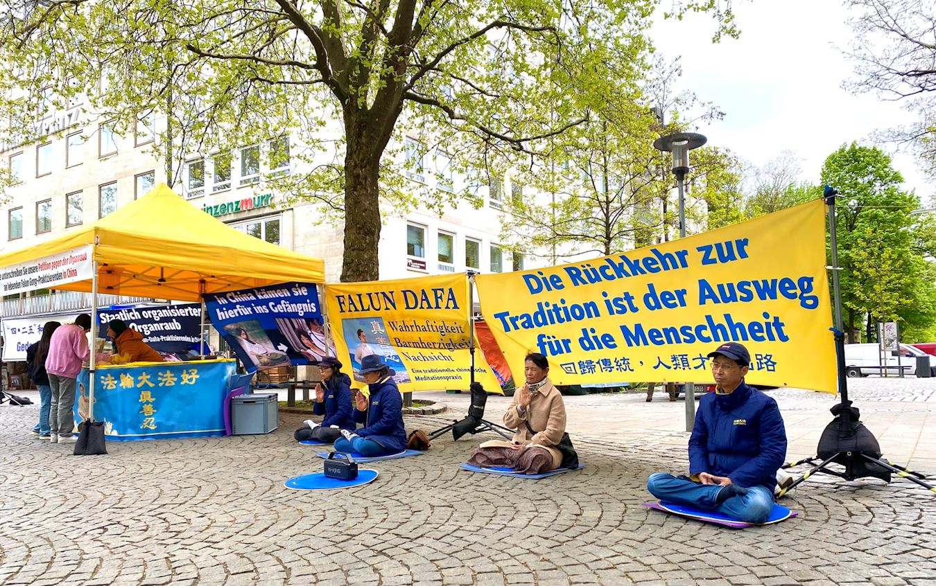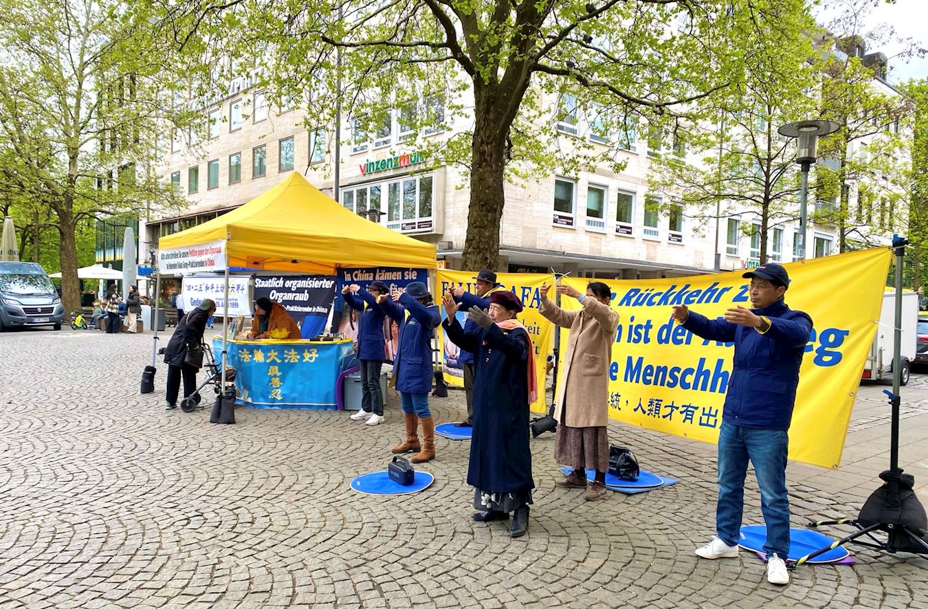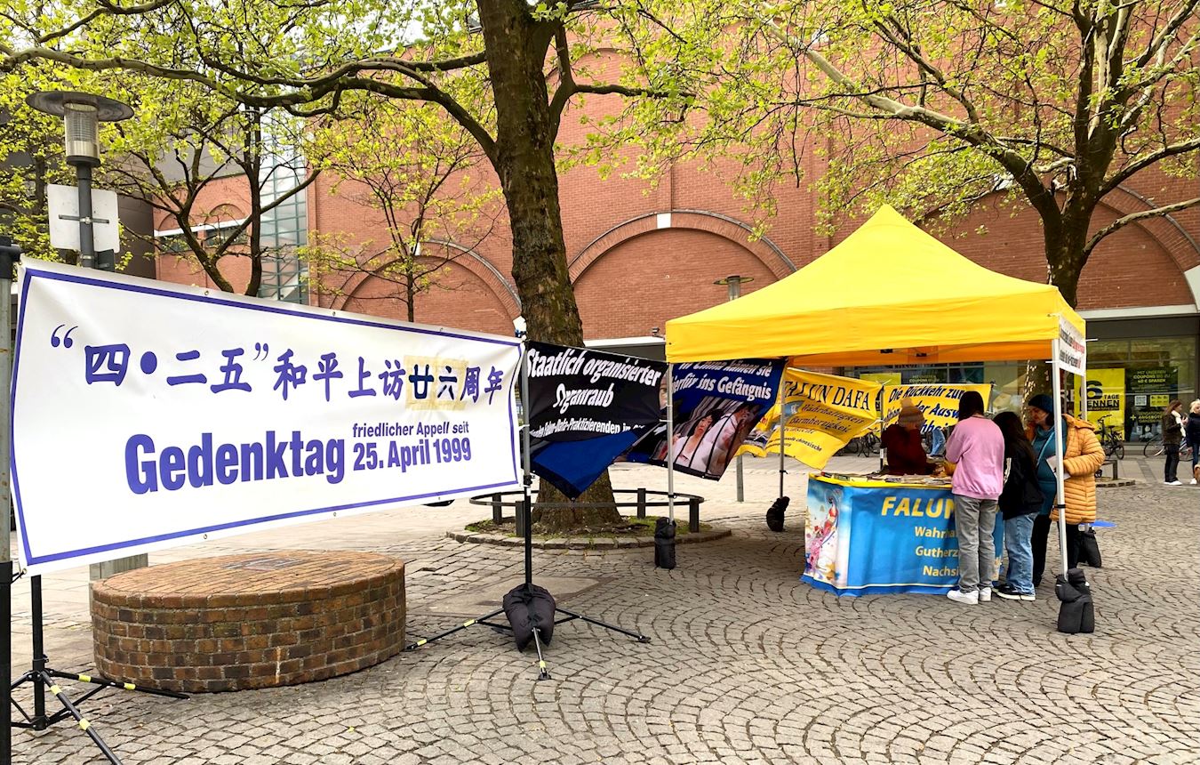 当天,法轮功学员在弗赖堡大学前老犹太教堂广场(Platz der Alten Synagoge)上挂起横幅,包括介绍法轮功功法、法轮功弘传世界、共同制止中共迫害法轮功等横幅,并展示了法轮功功法。从老犹太教堂广场走过去的路人,很多人驻足观看,也有人向学员打出各种手势表示支持。