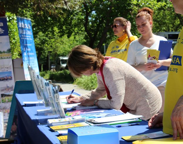 上午十时,法轮功学员们在中使馆前的草坪上竖立起横幅和真相展板,一面面传递着真相的横幅在明媚的阳光映射下更加耀眼和醒目,引来过路行人关注的目光。路人们纷纷停下脚步,前来了解真相,支持和赞佩法轮功学员们二十六年来坚持和平理性反迫害的壮举并签字谴责中共残酷迫害法轮功学员甚至活摘器官的罪行。