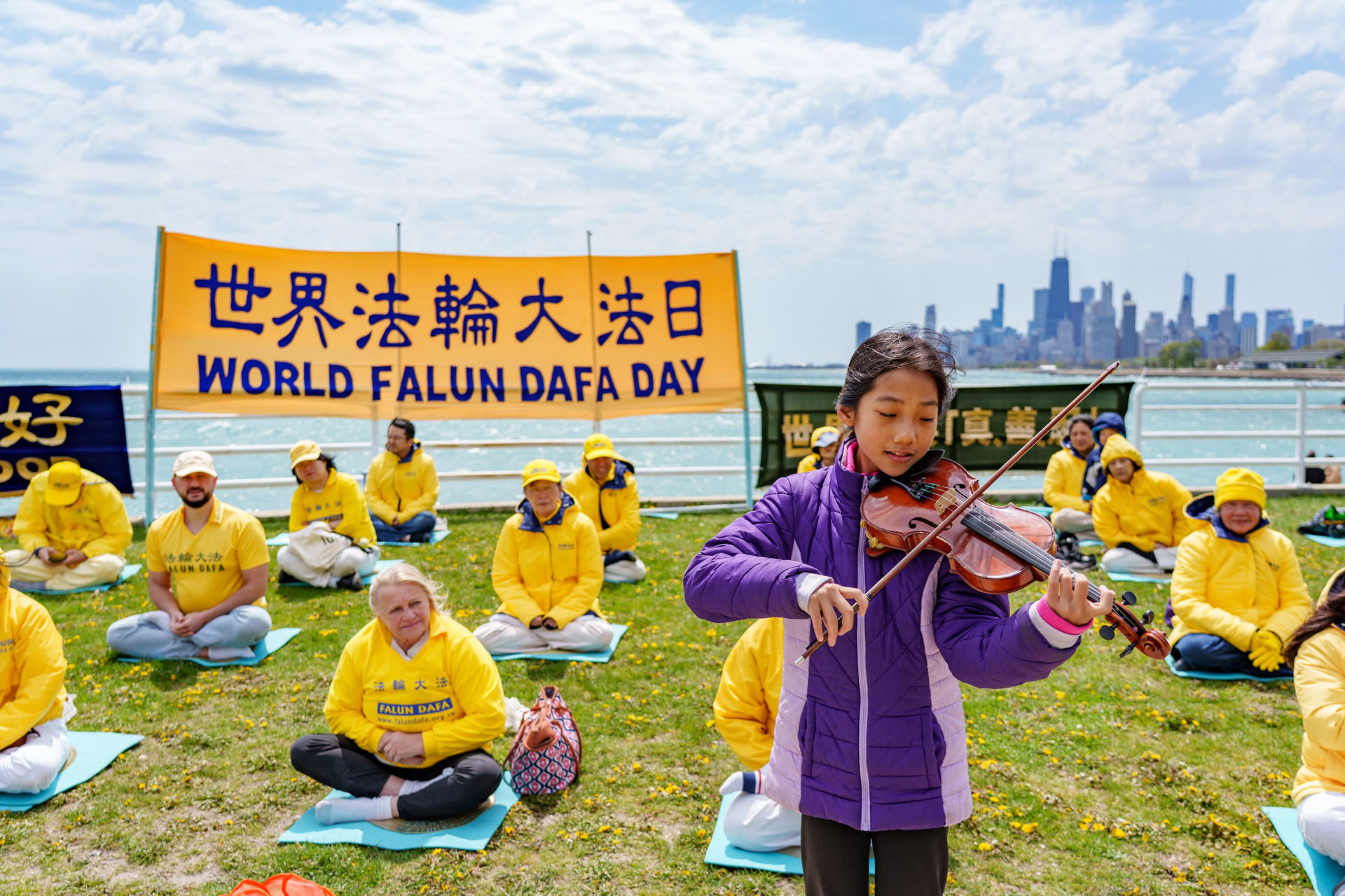 【明慧网二零二五年五月十二日】二零二五年五月十日,美国大芝加哥地区部分法轮功学员在芝加哥密西根湖畔的和平信号纪念碑公园(Signal of Peace Monument)举行活动,庆祝世界法轮大法日,恭祝法轮大法创始人李洪志师父华诞。今年的“五·一三”是法轮大法弘传世界三十三周年,法轮功学员集体炼功、表演庆祝节目,与芝加哥民众、游客分享修炼“真、善、忍”的美好,表达对师父的感恩。