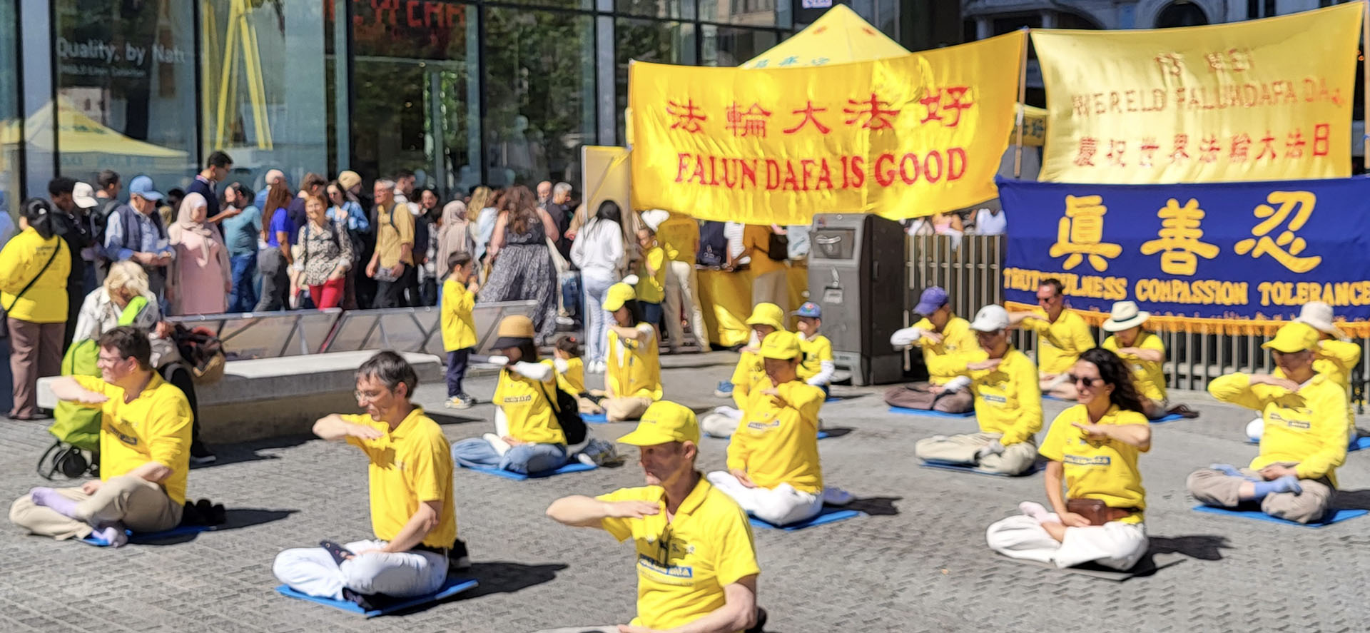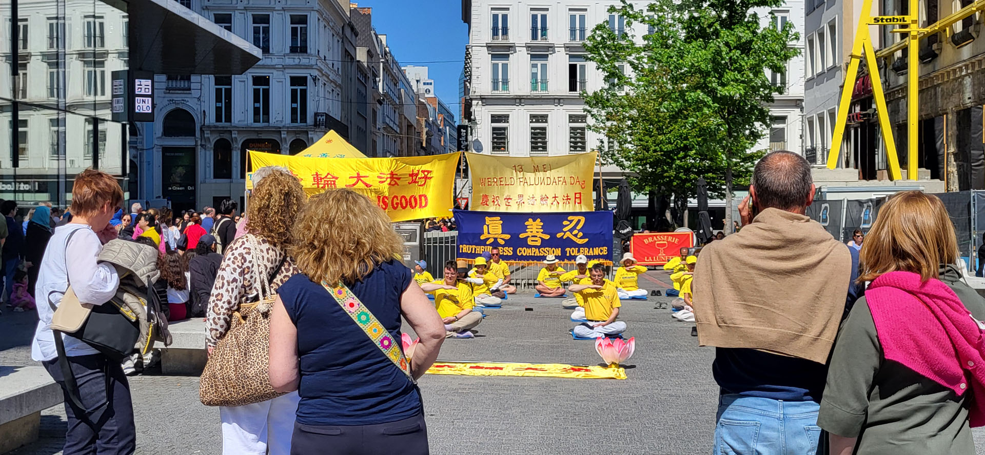 布鲁塞尔市中心的广场上,人潮往来,阳光和煦。法轮功学员伴随悠扬的炼功音乐,那特有的缓、慢、圆的整齐动作,吸引着人们驻足观看并流连忘返,许多人表达了对法轮大法的兴趣与敬意。