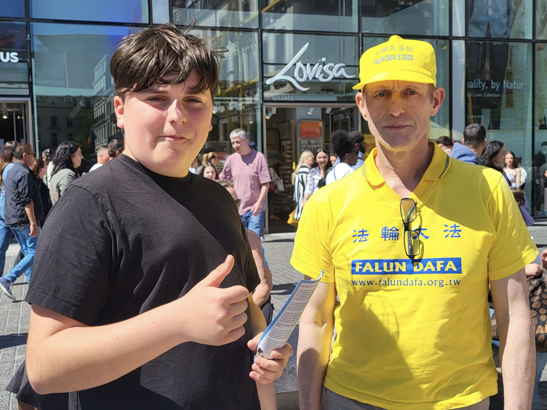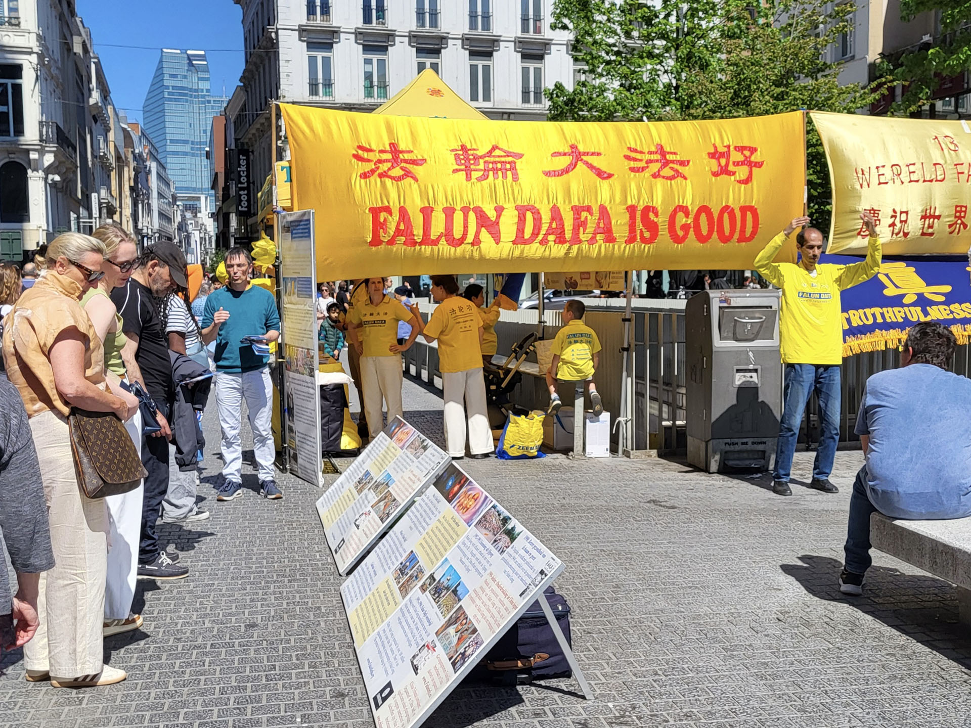 【明慧网二零二五年五月十三日】(明慧记者唐容比利时布鲁塞尔报道)二零二五年五月十日,晴朗的天空、温暖的气温,在比利时布鲁塞尔的街头,法轮功学员举行庆祝活动,庆祝法轮大法弘传三十三周年,以及即将到来的第二十六届五一三世界法轮大法日,并与公众分享法轮大法的美好。同时恭祝法轮功创始人李洪志师父生日快乐。