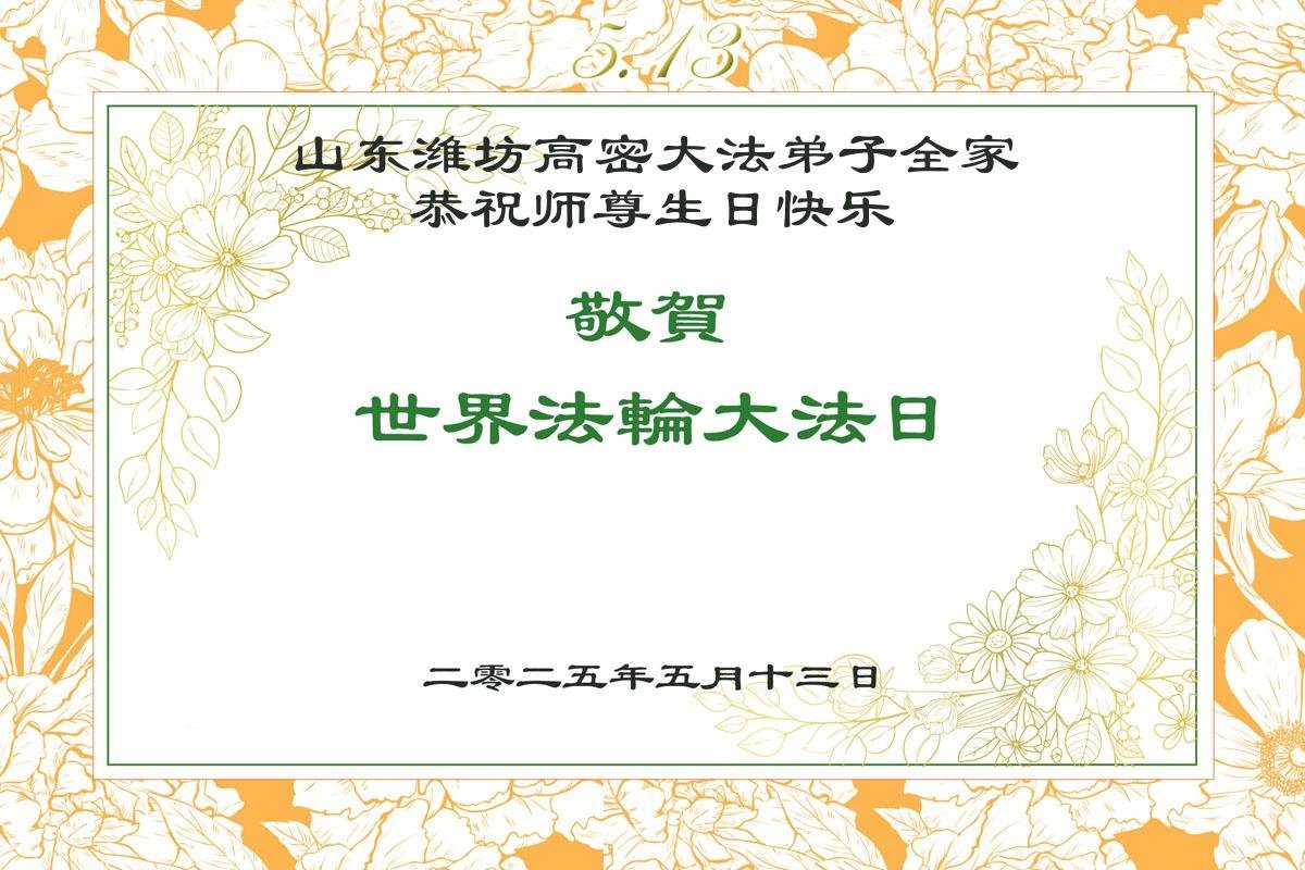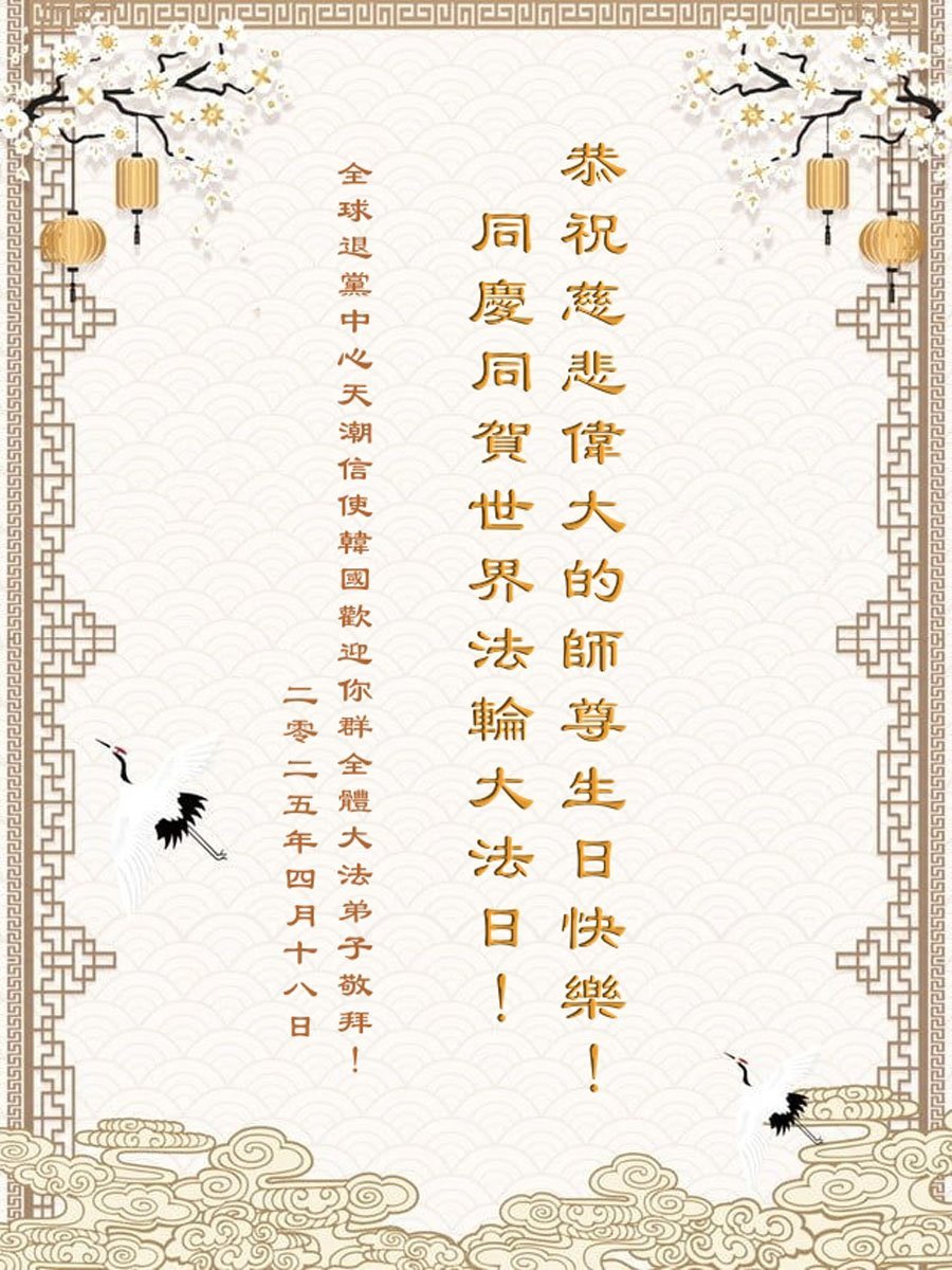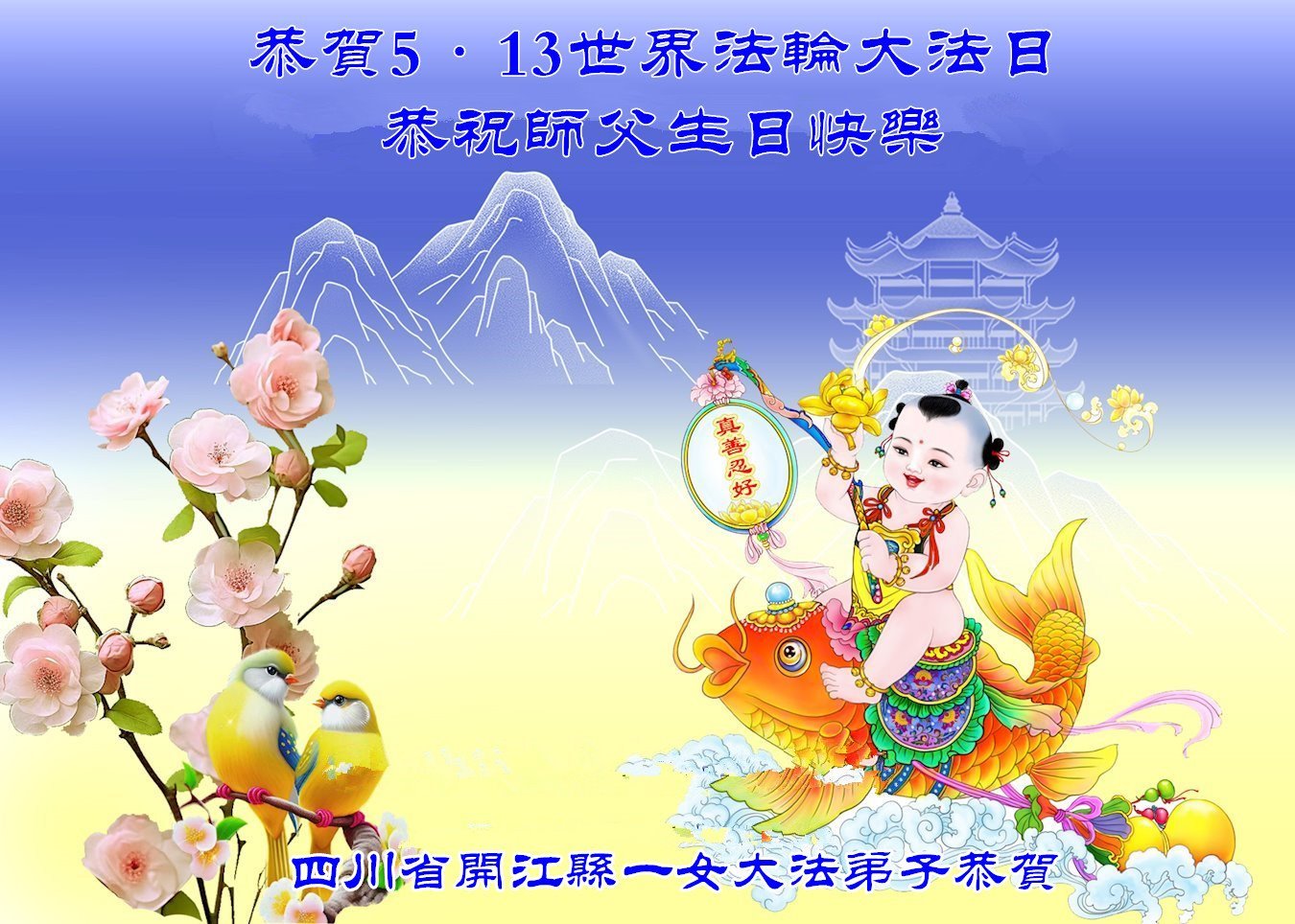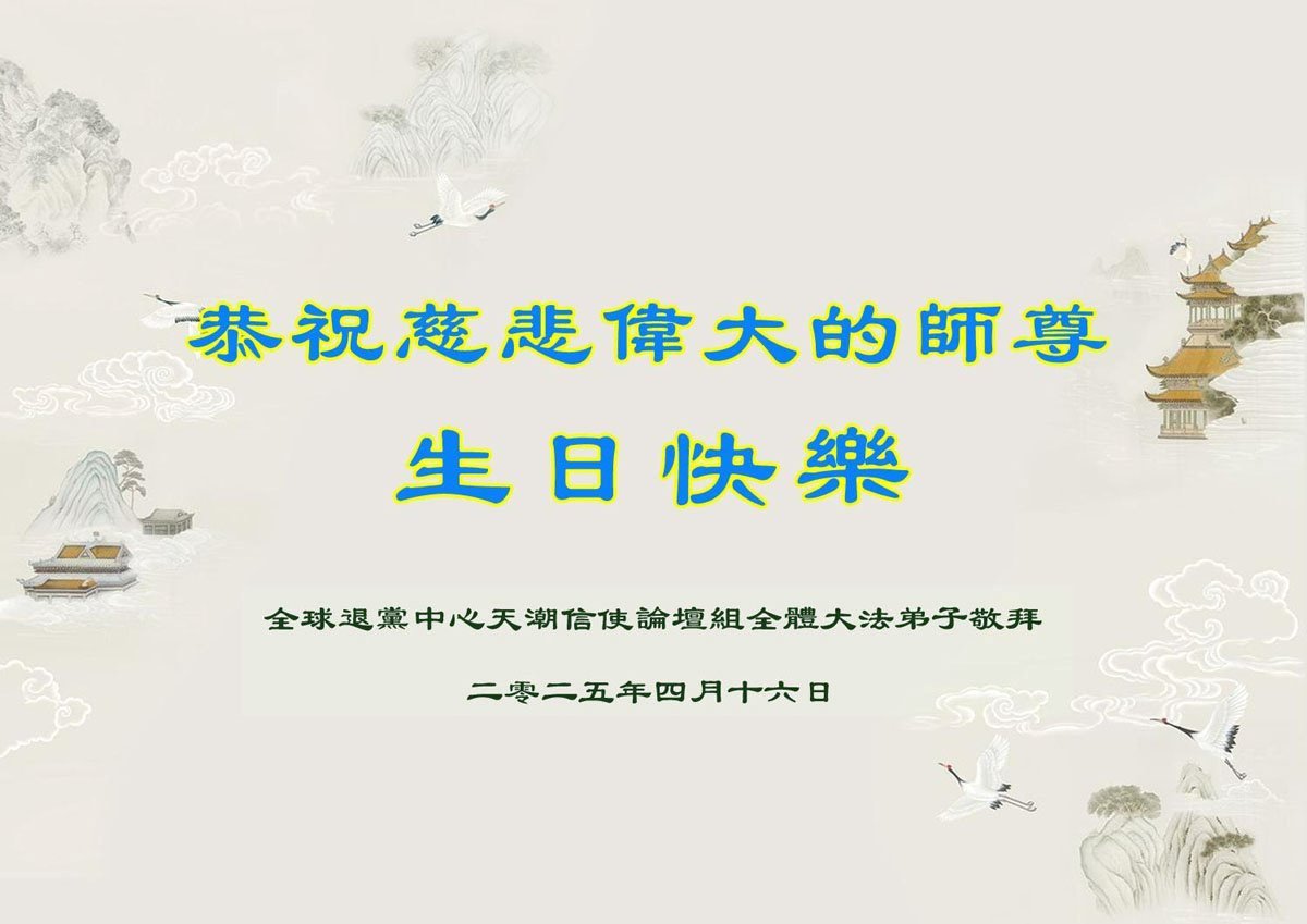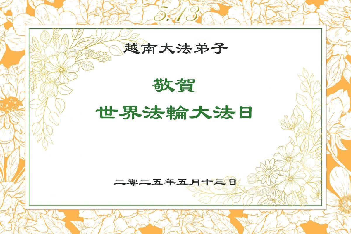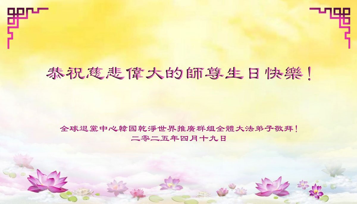 以下是来自韩国、日本、印度、马来西亚、新加坡、中国、菲律宾、印度尼西亚、越南、老挝、泰国、香港、澳门、台湾、阿联酋、伊朗、土耳其、波兰、俄罗斯、法国、英国、爱尔兰、德国、西班牙、意大利、希腊、比利时、荷兰、芬兰、丹麦、瑞典、奥地利、挪威、斯洛伐克、克罗地亚、塞尔维亚、黑山、澳洲、新西兰、美国、加拿大、厄瓜多尔、哥伦比亚、委内瑞拉、巴西、秘鲁、拉脱维亚、波斯尼亚和黑塞哥维那等国家和地区大法弟子致敬师尊的部份贺词贺卡。