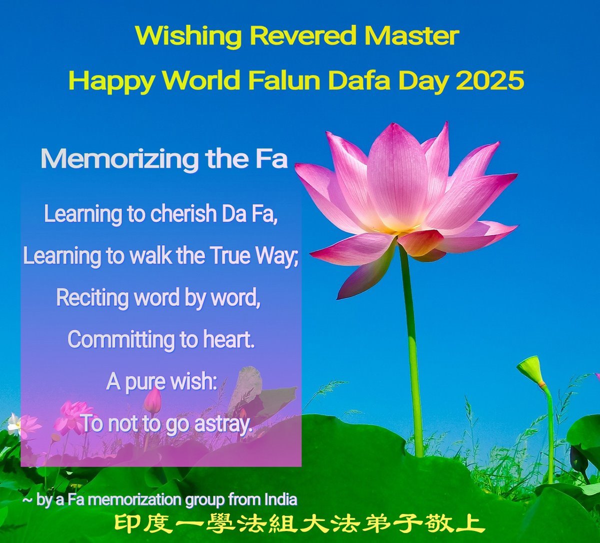 印度一位19岁大法弟子写道(译文):“师父的教诲赋予了我生命的意义,引导我向内找,更加慈悲,以平静和内心的力量面对挑战。我渴望以更加精進、纯净的思想和符合真、善、忍的心态走好我的路。我知道修炼中的每一次提升都体现着您无边的慈悲。”