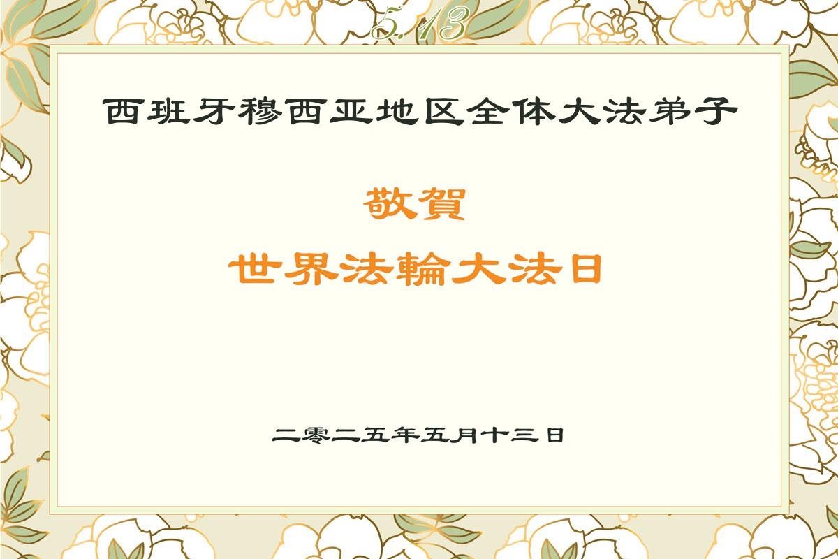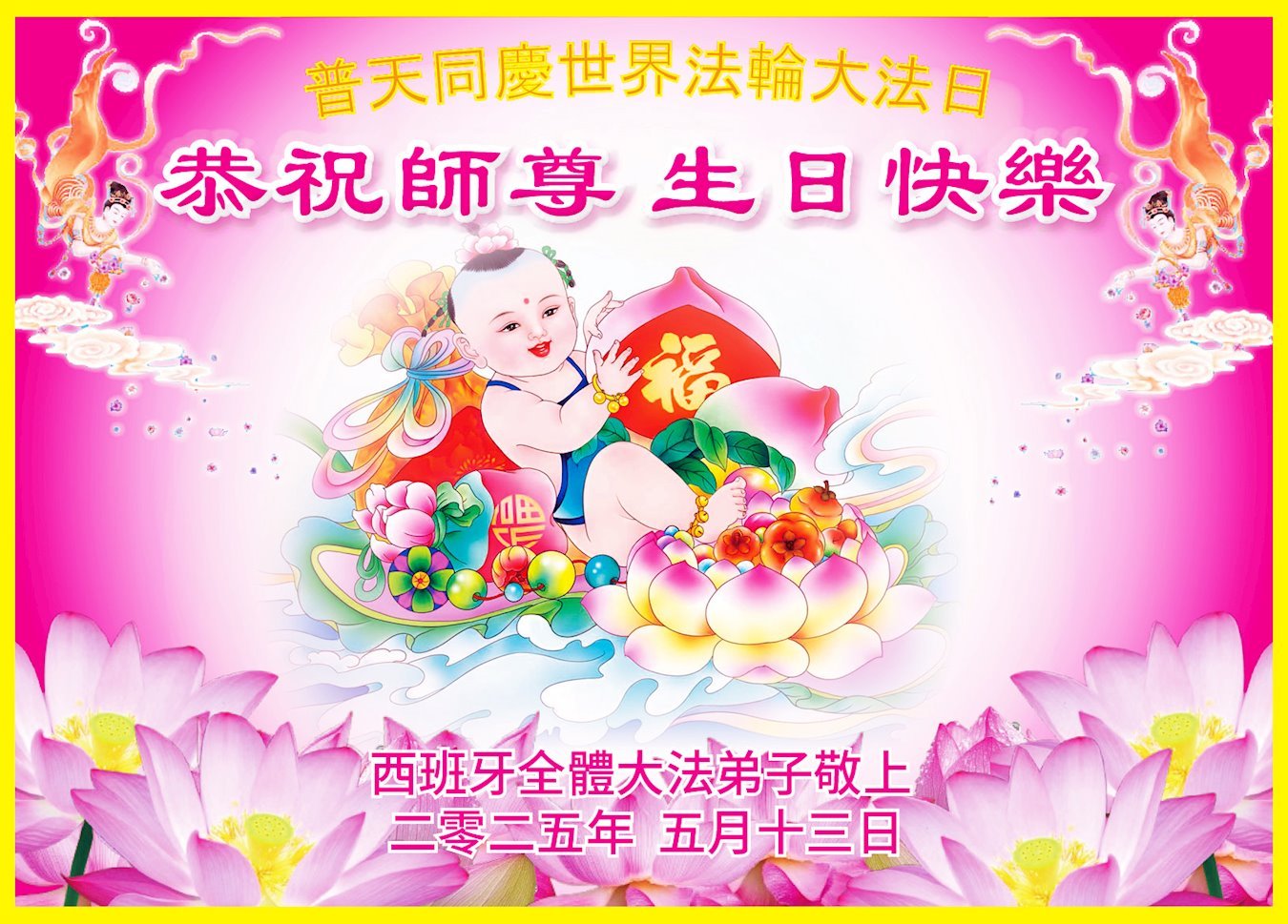 西班牙全体大法弟子敬祝慈悲伟大的师尊生日快乐!普天同庆5.13世界法轮大法日!