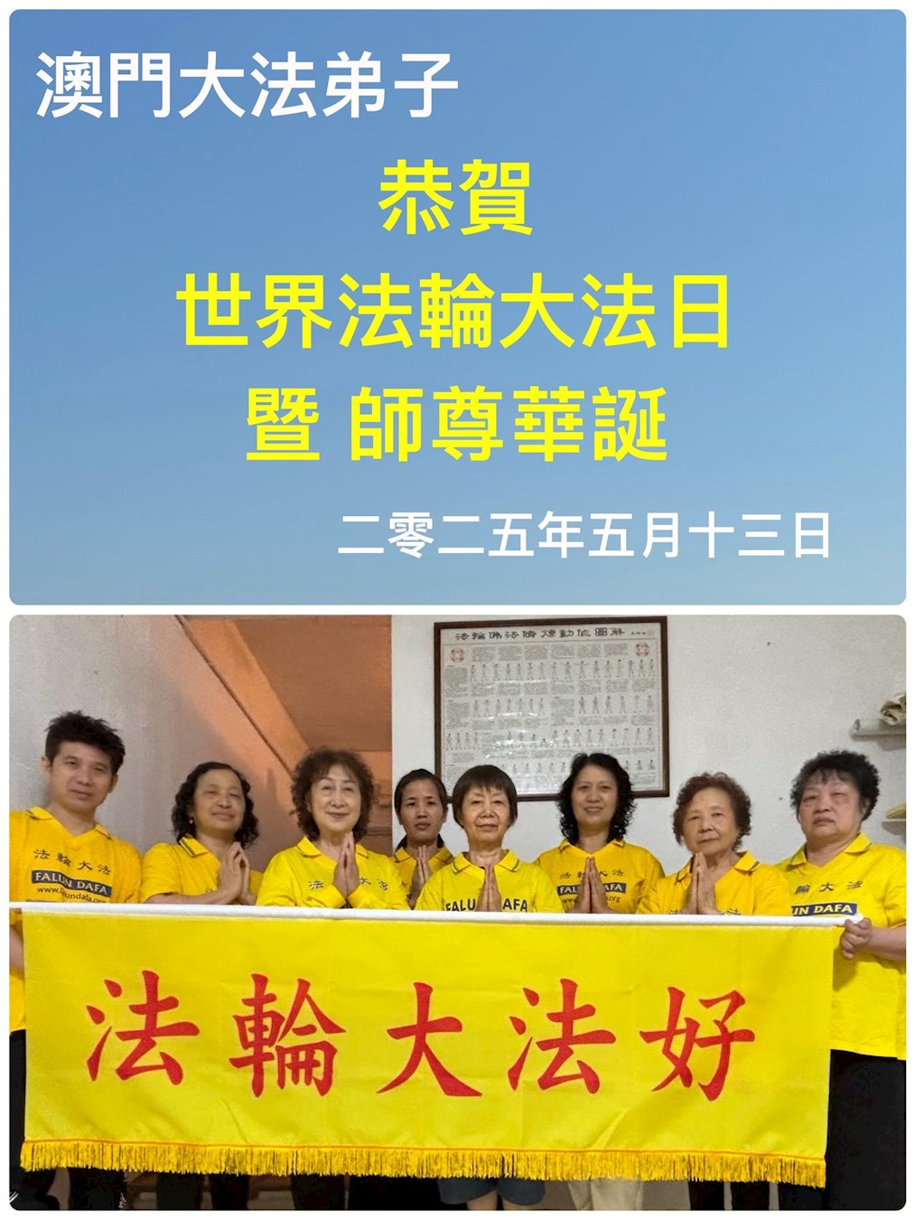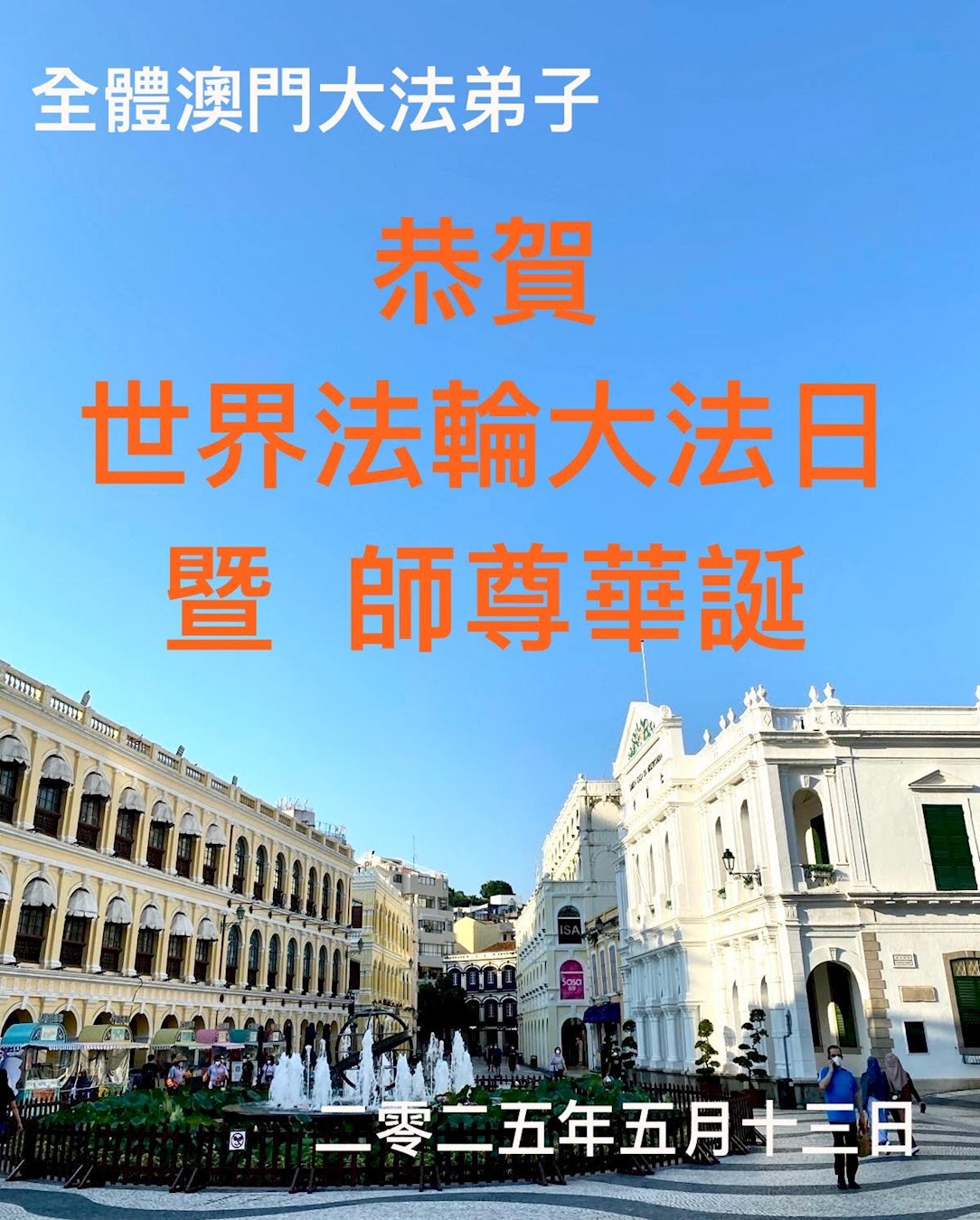 全体澳门大法弟子恭贺世界法轮大法日!恭祝师尊生日快乐!