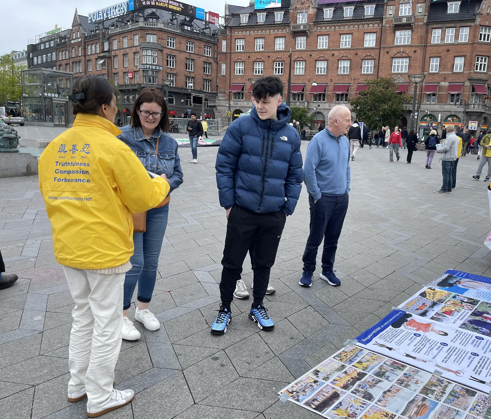 一对夫妇来到活动现场,法轮功学员向他们介绍,法轮功在世界的洪传,今天是为了庆祝法轮大法日举办活动,先生来自苏格兰,太太是丹麦人。他们听得很认真,对真善忍的理念非常认同。他们很高兴知道这些信息并表示:祝贺法轮大法日 。