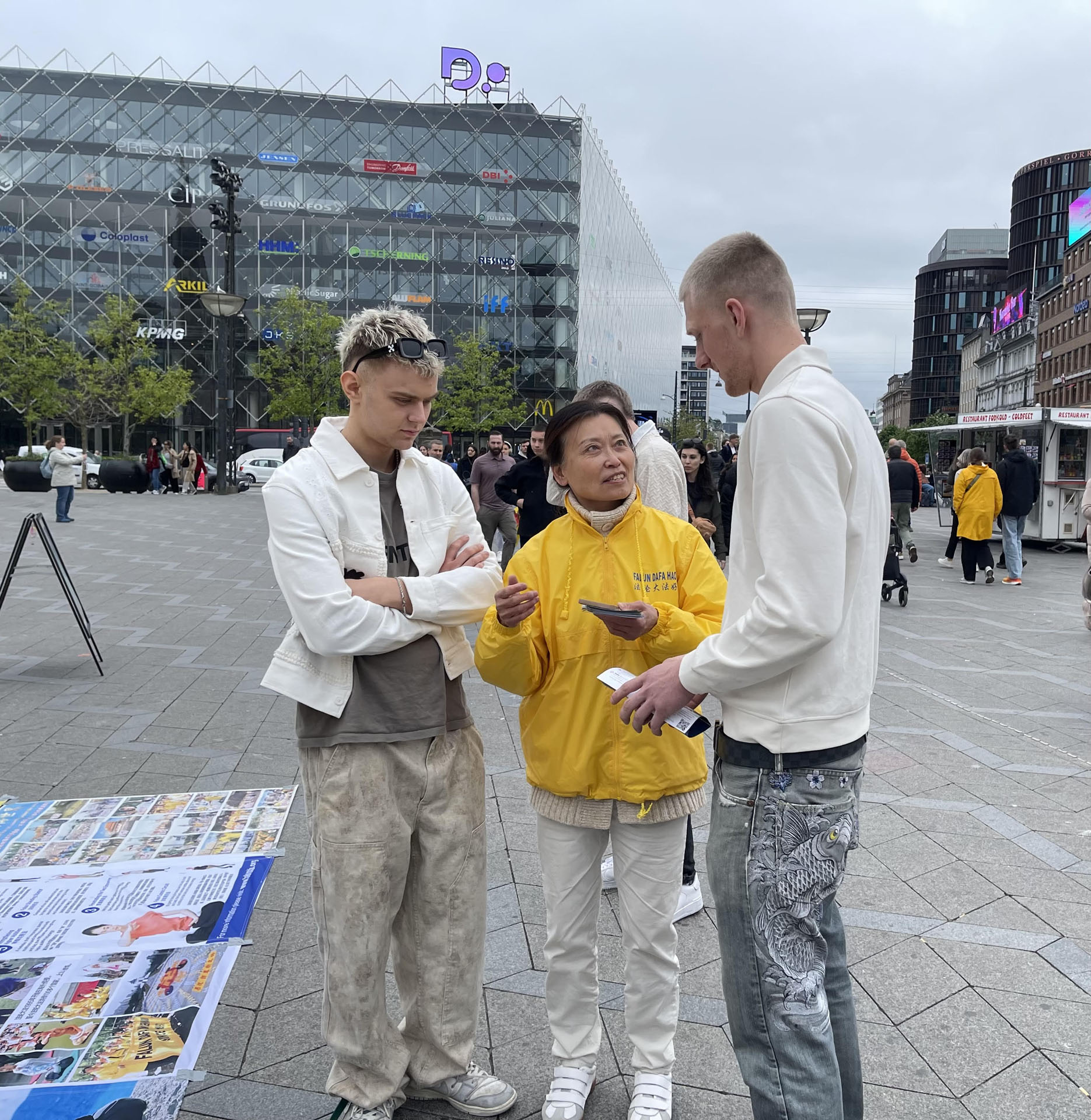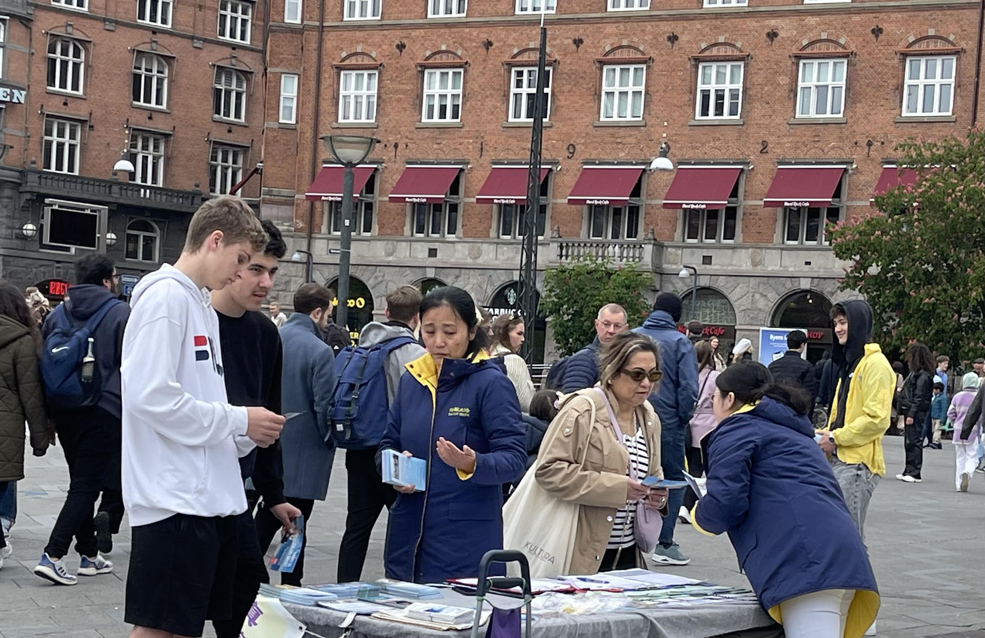 一位丹麦年轻人,拿了一张法轮功简介之后,看到学员手里的中文大纪元报纸和中文真相小册子,报纸头版上有李洪志师父的经文《为什么会有人类》,他表示很希望得到。他看出学员的疑惑,一边说没关系,一边用手机扫描,马上翻译成英文的,他立刻把“为 什么会有人类”的英文读出来了。对这个标题很感兴趣。他保证,报纸和真相小册子他一定好好看,然后高兴地走了。