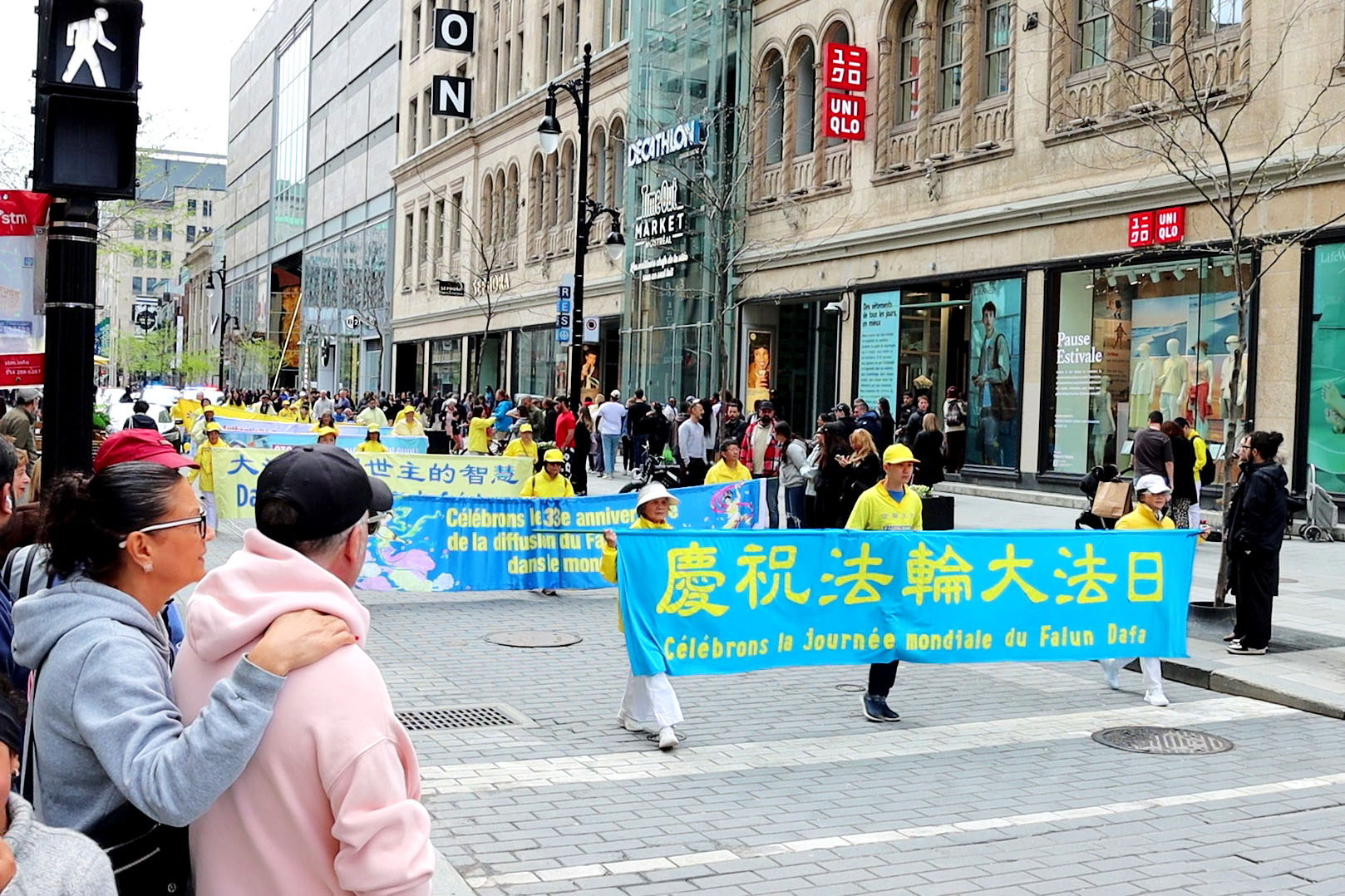 祥和壮观的游行队伍从凯博广场出发,穿过市中心主干道圣凯瑟琳大街,抵达终点市中心地标广场——菲利浦广场。天国乐团振奋人心的乐曲、炼功方阵舒缓柔和的动作,以及横幅上的内容,向人们传递着法轮大法为人带来福祉与希望的美好信息。