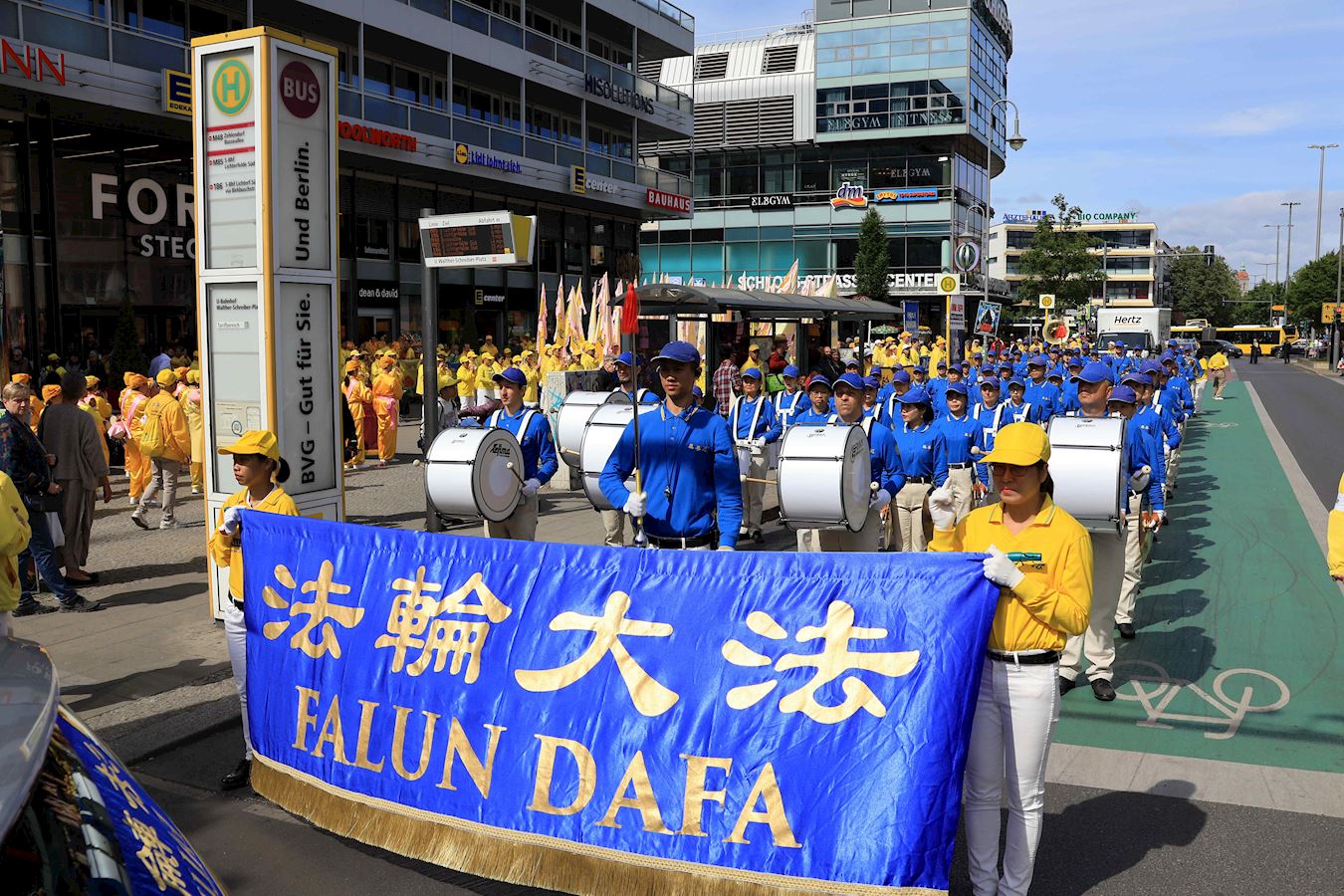(明慧记者站德国柏林报道)飞舞的金龙,活泼的舞狮,铿锵有力的腰鼓队让很多德国观众耳目一新;身着一片天蓝的军乐团演奏的乐曲,以及优美的功法演示,让人感受到心灵的慰藉。这看似很有中国特色的游行队伍,却有很多金发蓝眼的西方人。独特的组合,生动而又祥和的游行队伍吸引了很多路人。