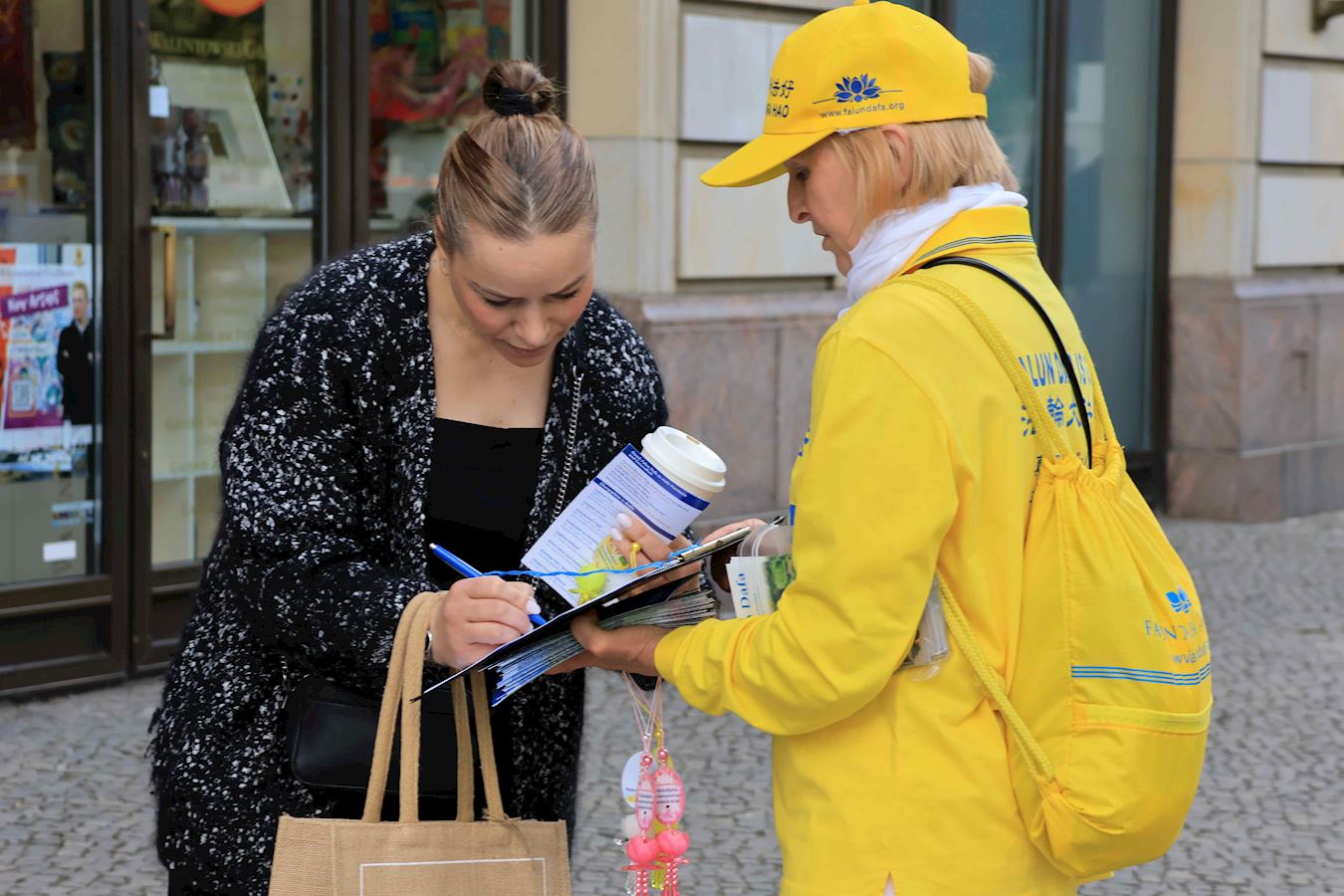 埃莉诺·瓦西内(Eleonoree Vasinee)静静的站在亚历山大广场(Alexanderplatz),观看法轮大法学员的演出。她来自乌克兰,只在柏林待几天就又要回去了。当她从学员那听闻真善忍时,她落泪了,那一刻似乎战争带来的压力,生活中的未知都得以释放。瓦西内和学员亲切拥抱,感谢她告诉自己关于大法的讯息,让自己获得慰藉。“这个活动非常重要,能给中国人,给中国带来自由,我支持你们。”她感叹道:“活动展现的是庆祝节日的欢乐,但是当我读到传单中的内容时,我知道(法轮功在中国)情况很严峻。”她因此祝愿法轮功学员能:“获得胜利及自由。”