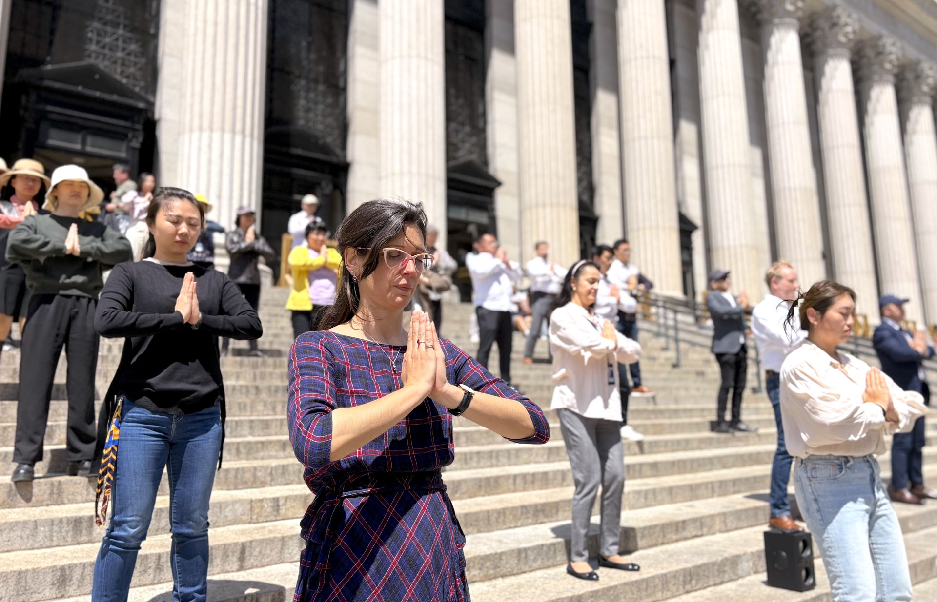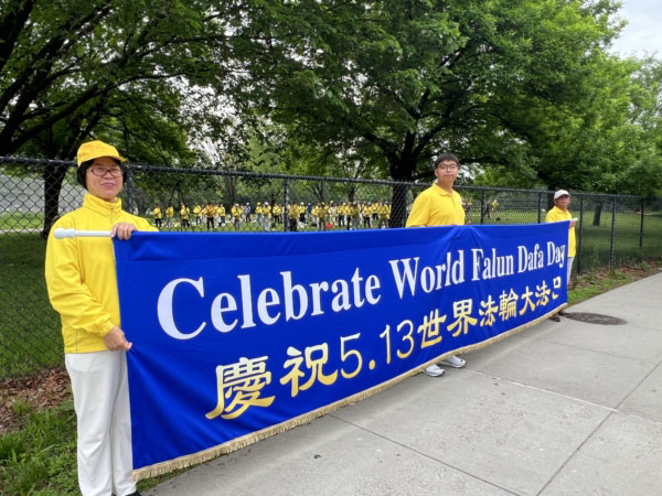 【明慧网二零二五年五月十六日】二零二五年五月十三日是“世界法轮大法日”暨法轮功创始人李洪志先生的华诞,这段时间,部分纽约法轮功学员在纽约及曼哈顿各处炼功点,举办户外集体炼功弘法活动,欢度这一普天同庆的日子。从全美最繁忙的交通枢纽之一的宾州车站(Penn Station),到人头攒动的布莱恩广场旁纽约公共图书馆(New York Public Library),再到华人聚居的曼哈顿唐人街及皇后区法拉盛,法轮功学员集体炼功的身影都是街头一道亮丽的风景线。