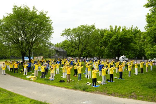 图5~8:纽约法拉盛法轮功学员集体炼功