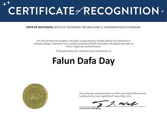 美国明尼苏达州州长发出表彰,表达对法轮大法的创始人李洪志先生的敬意,和对法轮大法修炼者遵循真善忍的感激,恭贺世界法轮大法日。