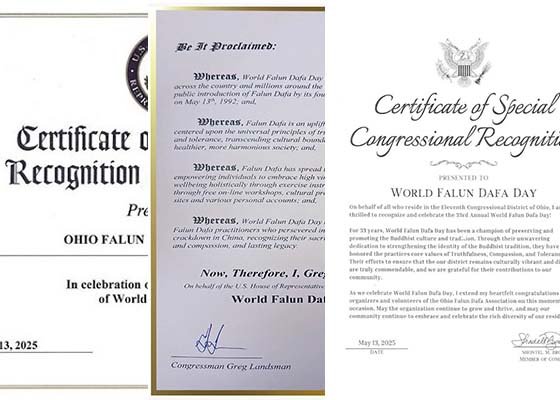 5月13日是第26届“世界法轮大法日”,俄亥俄州三个选区的联邦众议员大卫·P·乔伊斯,格雷格‧兰兹曼和肖妮尔·M·布朗褒奖法轮大法。