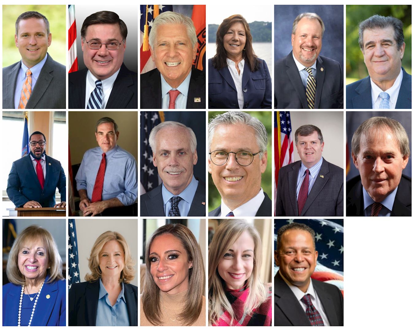 图1:第一排从左至右:橙县县长史蒂文·纽豪斯;苏福克县县长爱德华·罗梅恩;拿骚县县长布鲁斯·布莱克;达奇斯县县长苏·塞里诺;橙县地方检察官大卫·胡夫;橙县的米德尔敦市市长约瑟夫·德斯特法诺