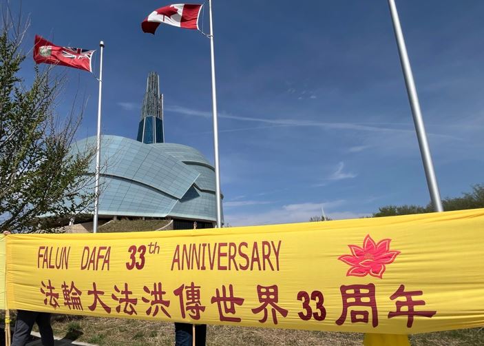 ![]() 图2~3:加拿大温尼伯法轮功学员在人权博物馆前打横幅 |