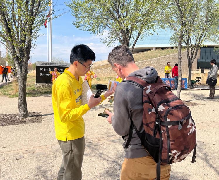 还有来自曼尼托巴大学的学生,他在大学里看过大卫·麦塔斯的纪录片后,很想了解法轮功,这次带着家人过来,和学员交谈了很久,了解的真相后,非常开心。他们都感受到了大法的祥和和学员的友善。