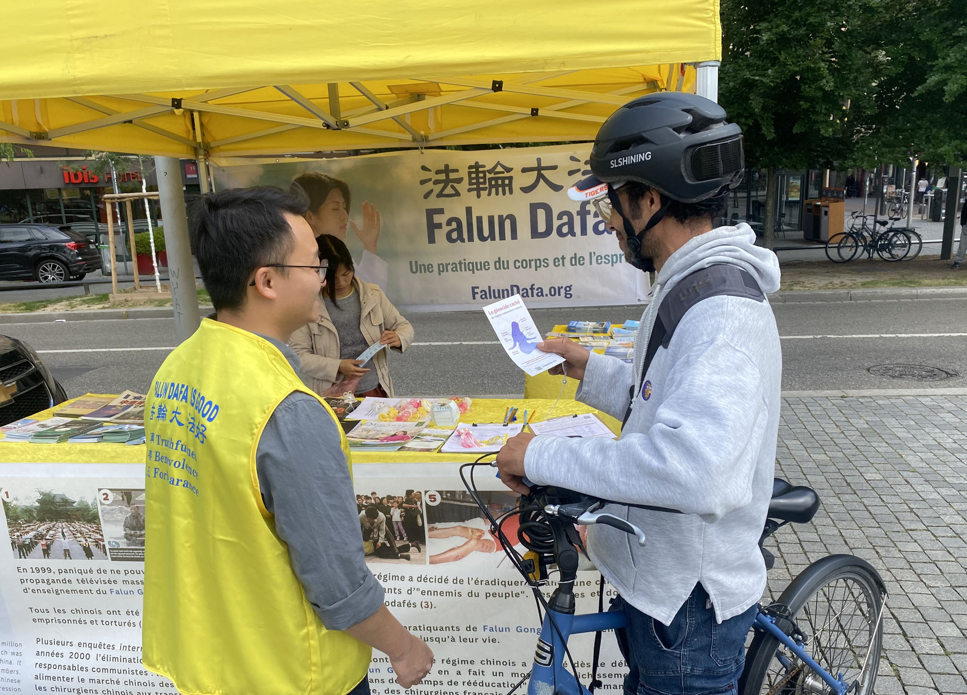 五月二十五日星期日,法轮功学员在斯特拉斯堡火车站广场举办了法轮功信息日。广场上悬挂了横幅,摆放了展板,展示有关法轮功修炼及法轮功学员在中国遭受迫害的图片和资讯。由于活动位于市中心和火车站之间,吸引了许多过路的民众前来观望。