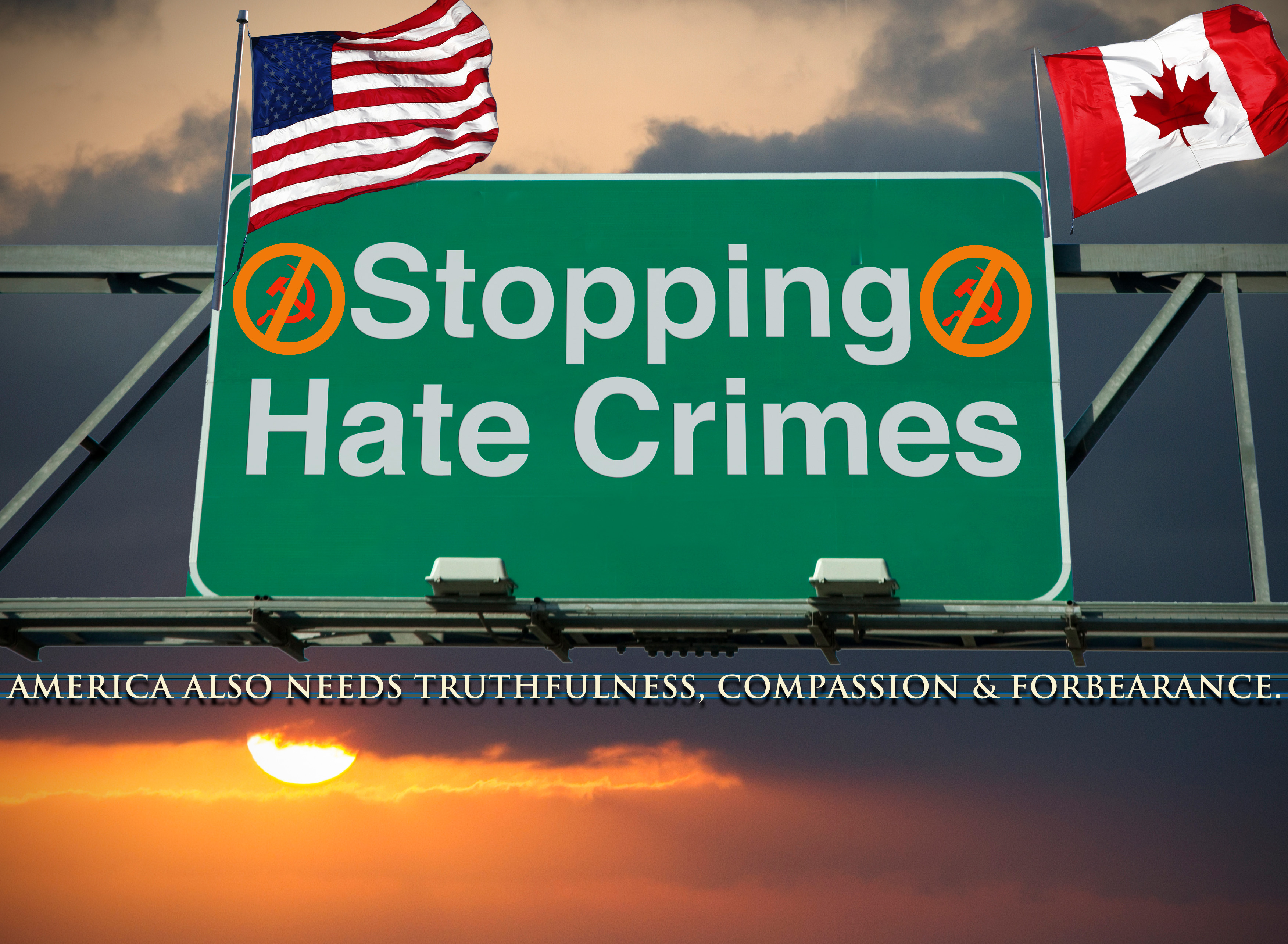 图3:制止中共的仇恨宣传,美国也需要真善忍。图片来源:明慧网合成