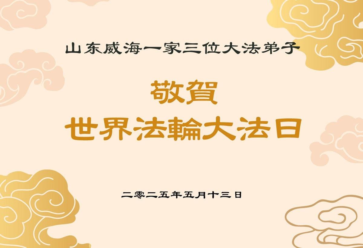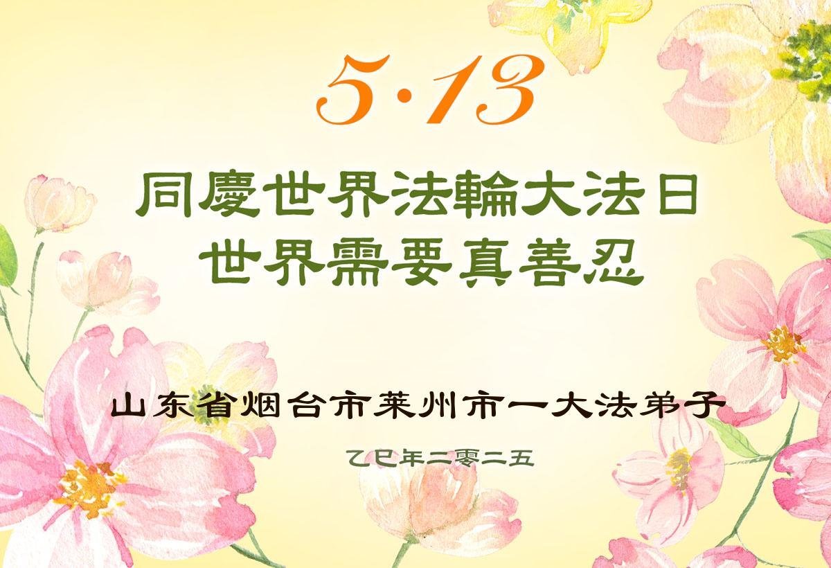 山东烟台一学法小组大法弟子恭贺世界法轮大法日!恭贺法轮大法传世33周年!我们学法小组全体大法弟子,在最后的时间里一定听师尊的话,修好自己,做好三件事,多救人,完成自己的使命,圆满随师还!