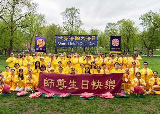 五月四日,美国新英格兰地区法轮功学员在波士顿公园举办庆祝活动,欢庆第26届世界法轮大法日,并借此机会表达对师父的无限感恩。