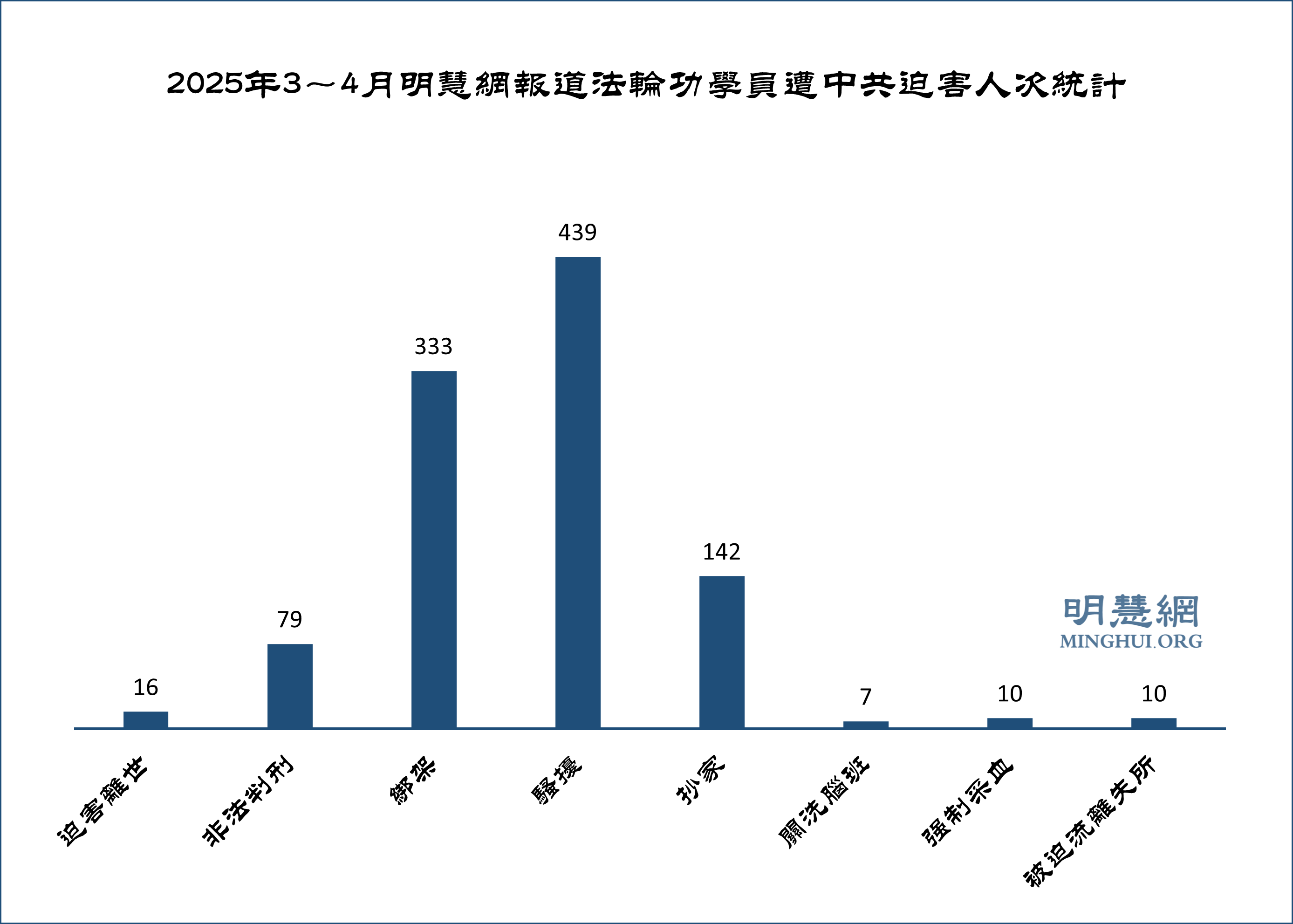 据明慧网报道统计,二零二五年三月至四月期间,明慧网获知并报道中国大陆772名法轮功学员遭中共绑架和骚扰(绑架333人;骚扰439人)。