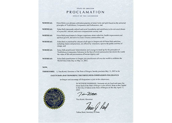 在法轮大法弘传三十三周年纪念日来临之际,美国俄勒冈州州长蒂娜·科泰克为五月十三日法轮大法日庆祝活动颁发了褒奖。