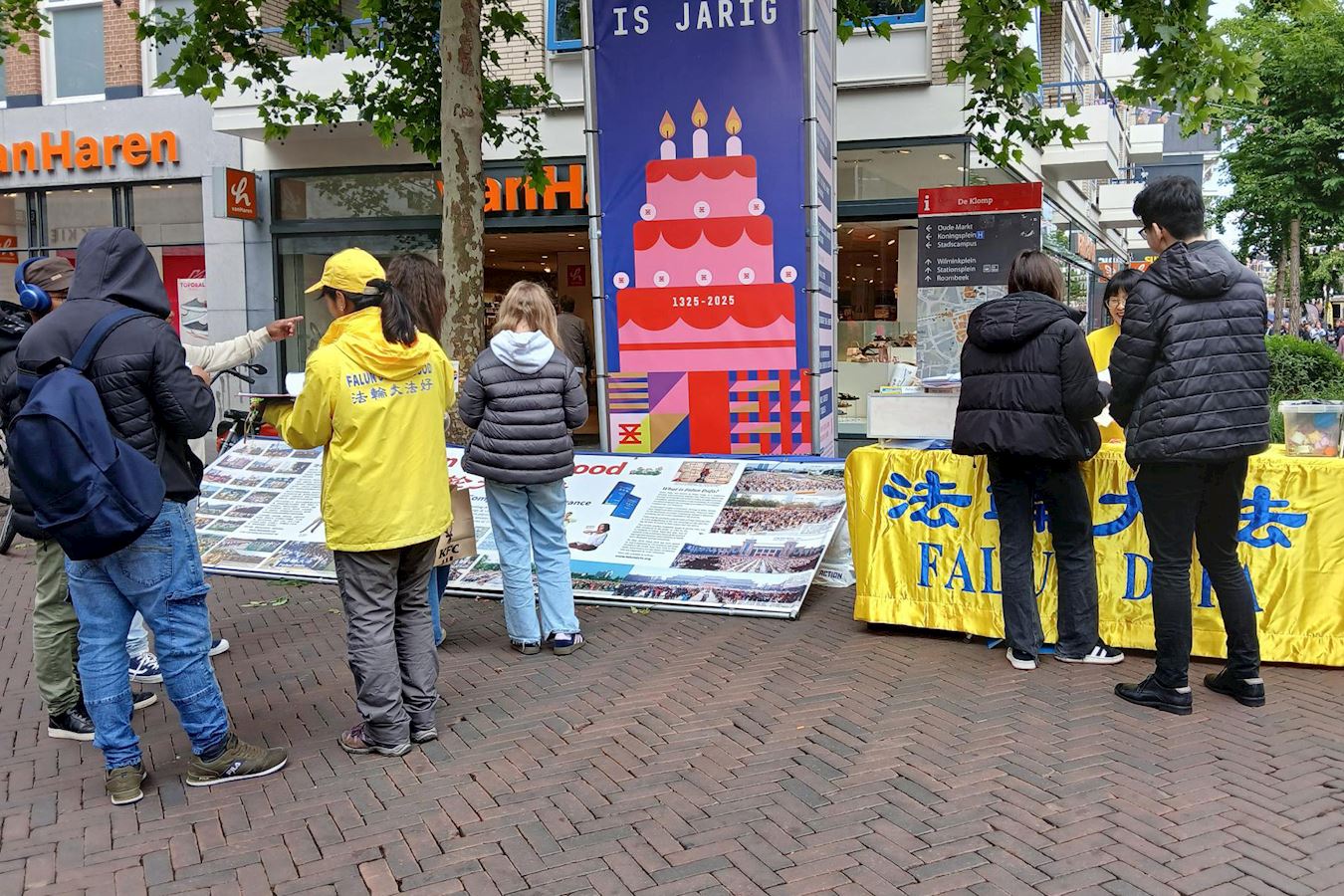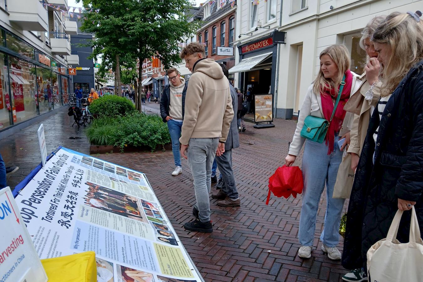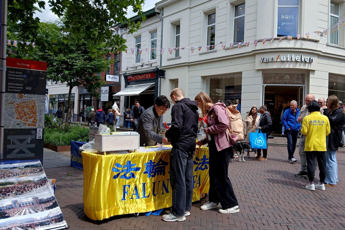 六月七日中午,恩斯赫德的长街(langestraat)游人如织,人们被法轮功学员的真相点吸引,驻足在真相展板前仔细阅读,并与法轮功学员交谈了解真相,签名支持反迫害。