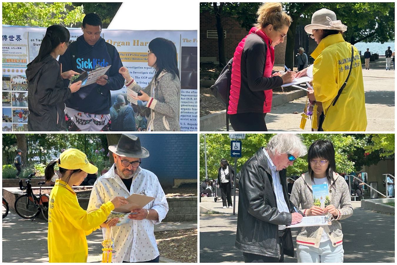 暖和的天气、和煦的阳光,多伦多的法轮功学员们在码头广场公园(Harbour Square Park)的大草坪上一早就开始了一整天的炼功、讲真相和征签活动,这里是市民及各地游客乘坐轮船前往湖心岛的必经之路。很多人都停下来拍照和听学员们介绍法轮功并签名反迫害,今年的G7+7(编者注:G7七国集团+欧盟国家+阿根廷、澳大利亚、印度、以色列、墨西哥、南韩和台湾)在加拿大召开,近日是法轮功学员给G7+7请愿书——《制止中共强制摘取器官》的征签活动,到六月近二十万个签名给G7+7。
