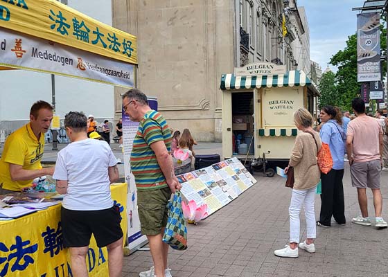 二零二五年六月十四日,比利时安特卫普市商业中心大街上,法轮功学员又一次搭建真相信息展位。