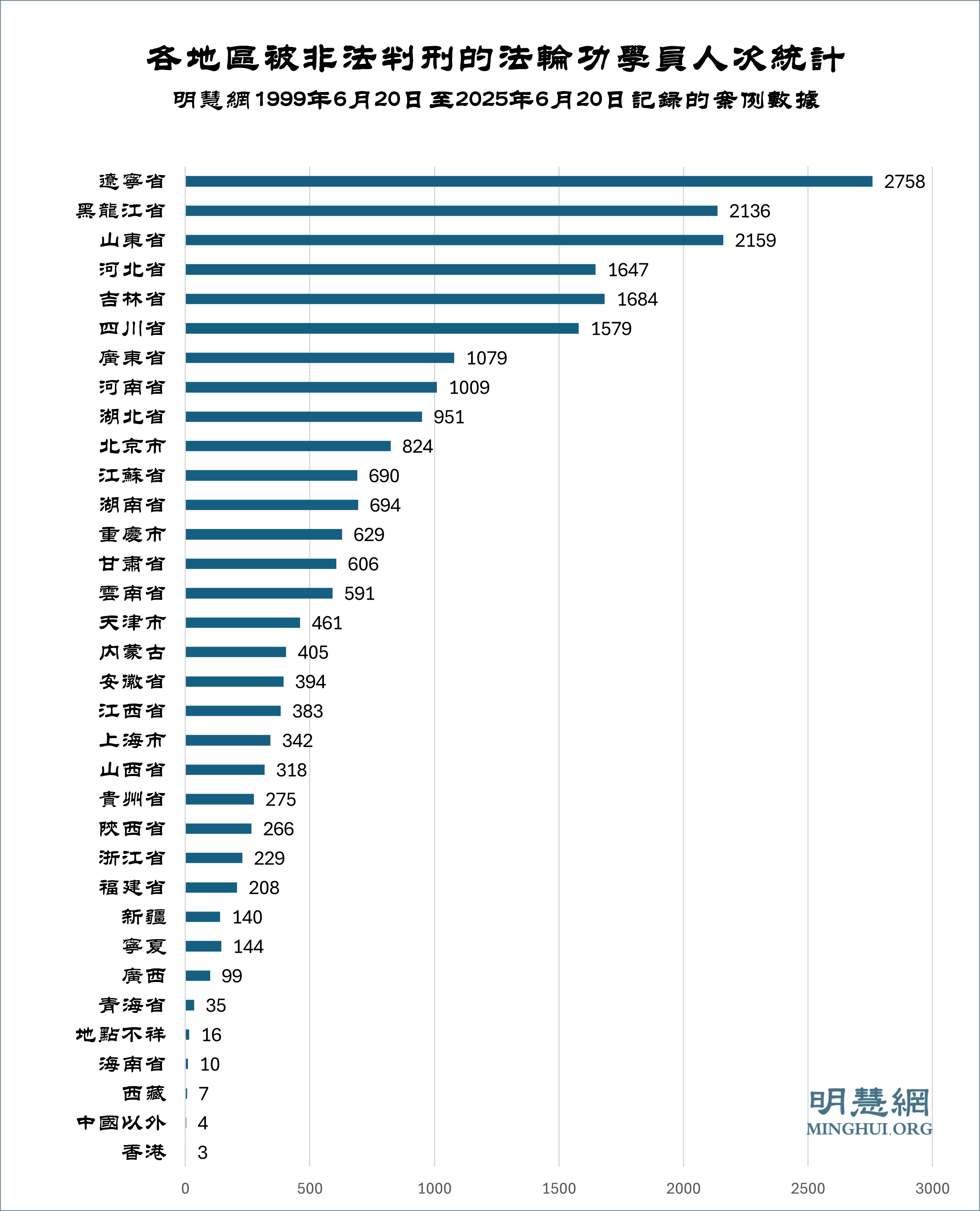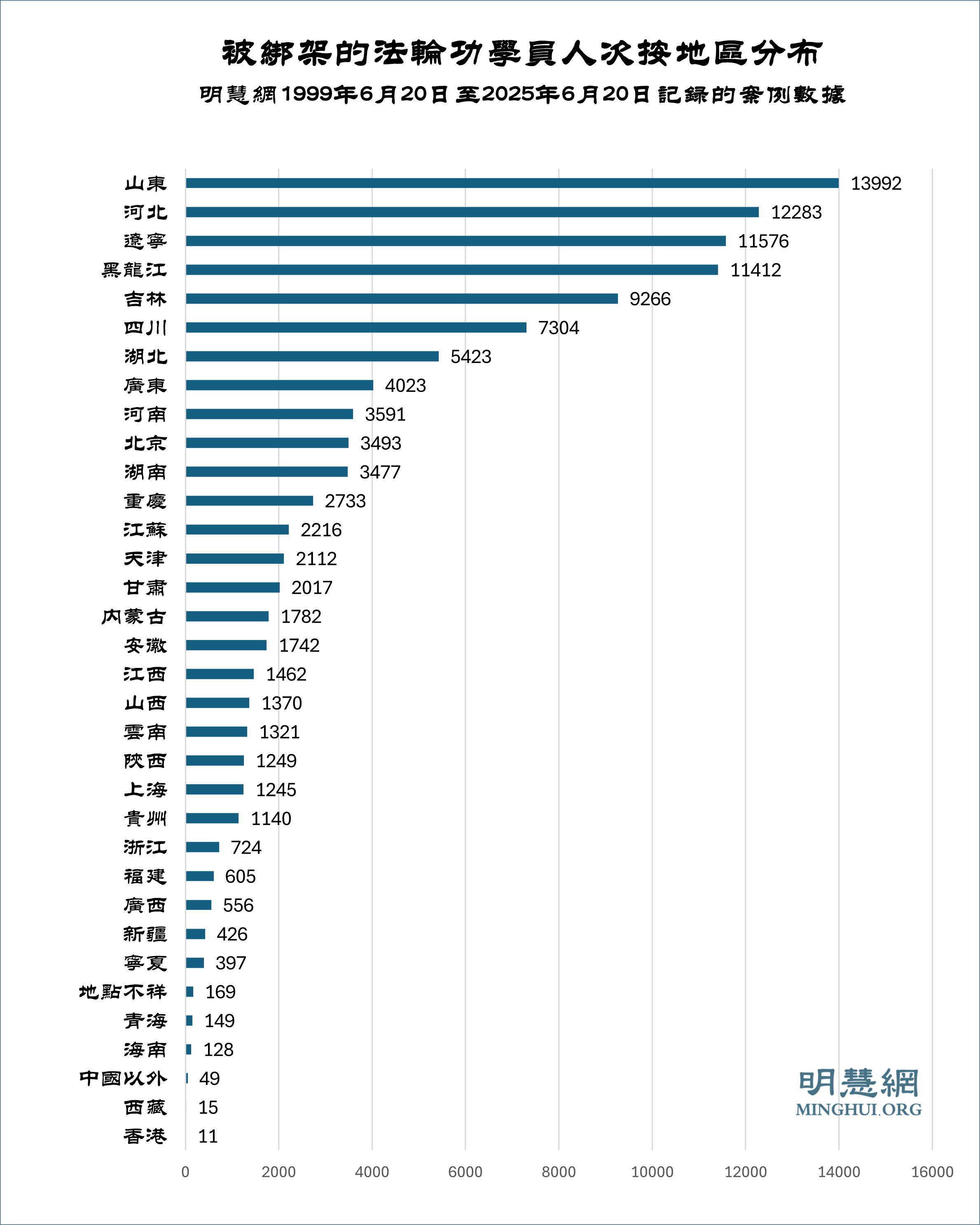 本文图表中2017年至2025年的数据皆来自于明慧统计报告,其中2017年至2023年的数据与《明慧网25年报告》有差异。这可能是造成按年分布人数和按地区分布的人数统计不能自洽的原因。