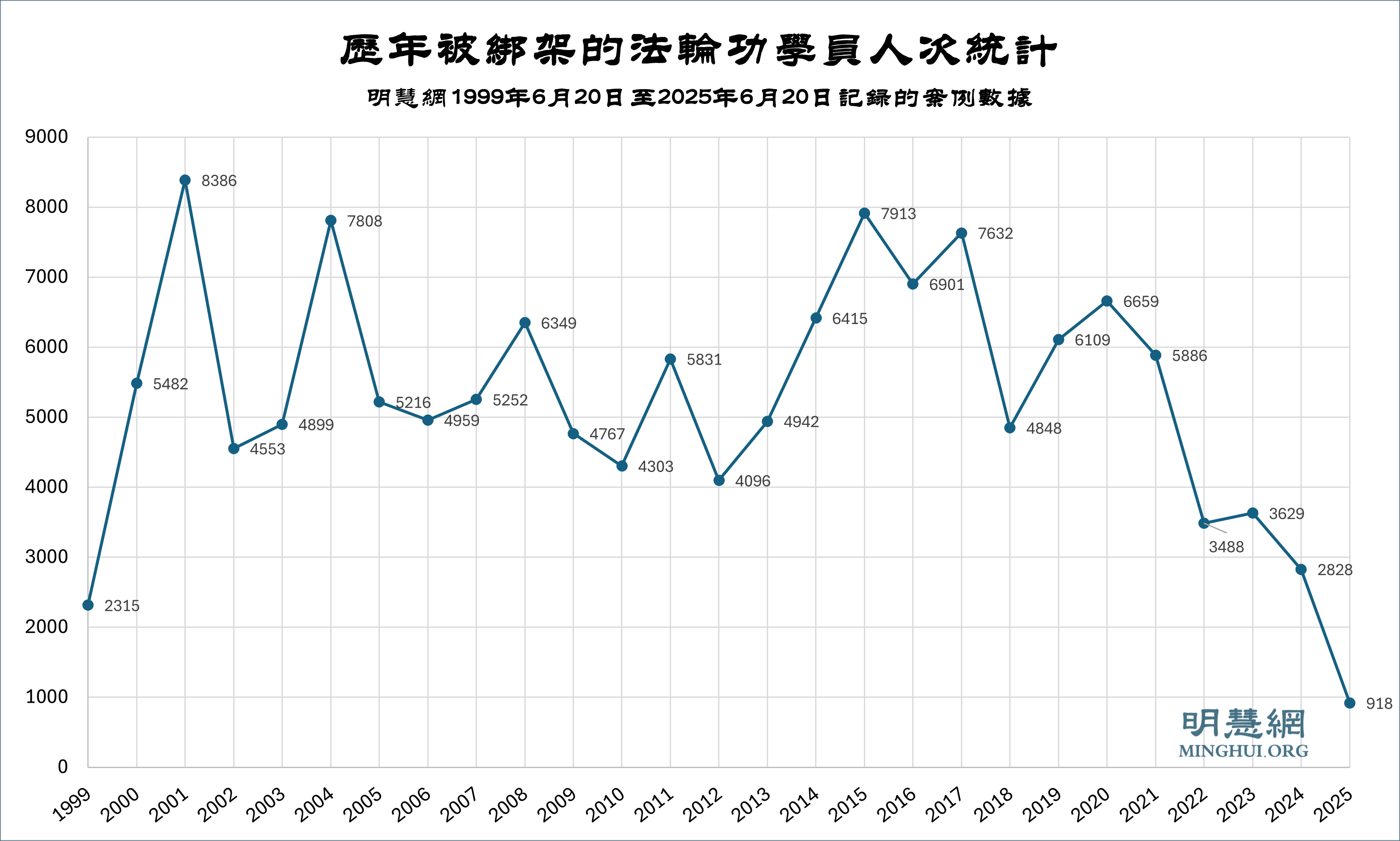 本文为大家提供的,是从一九九九年明慧网有数据以来至二零二五年六月二十日的一组迫害案例统计图表。以小见大,这组图表既反映了中共迫害法轮功的情况,也反映了当地大法弟子的报道能力,以及全体大法弟子二十六年来前仆后继、坚韧反迫害的成果。图三、五、七、九清晰地反映出迫害趋于结束的走向。