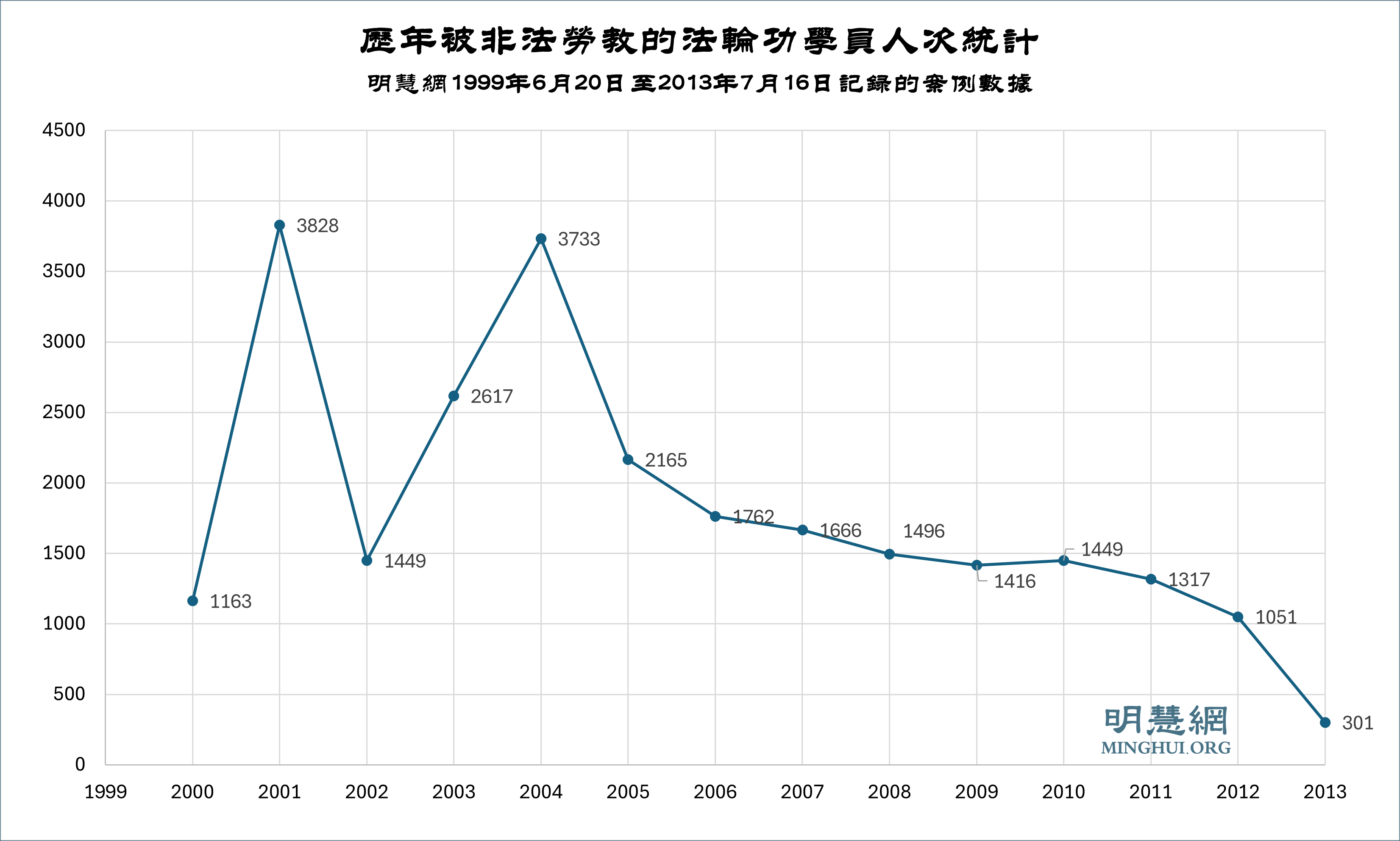 七、26年被非法劳教的法轮功学员人次统计(中共从苏联引進的、各地中共人员最广泛用以迫害法轮功的劳教制度已于2013年正式解体,故而此图表的年份到2013年截止。未报道出来的案例没有计入在内):
