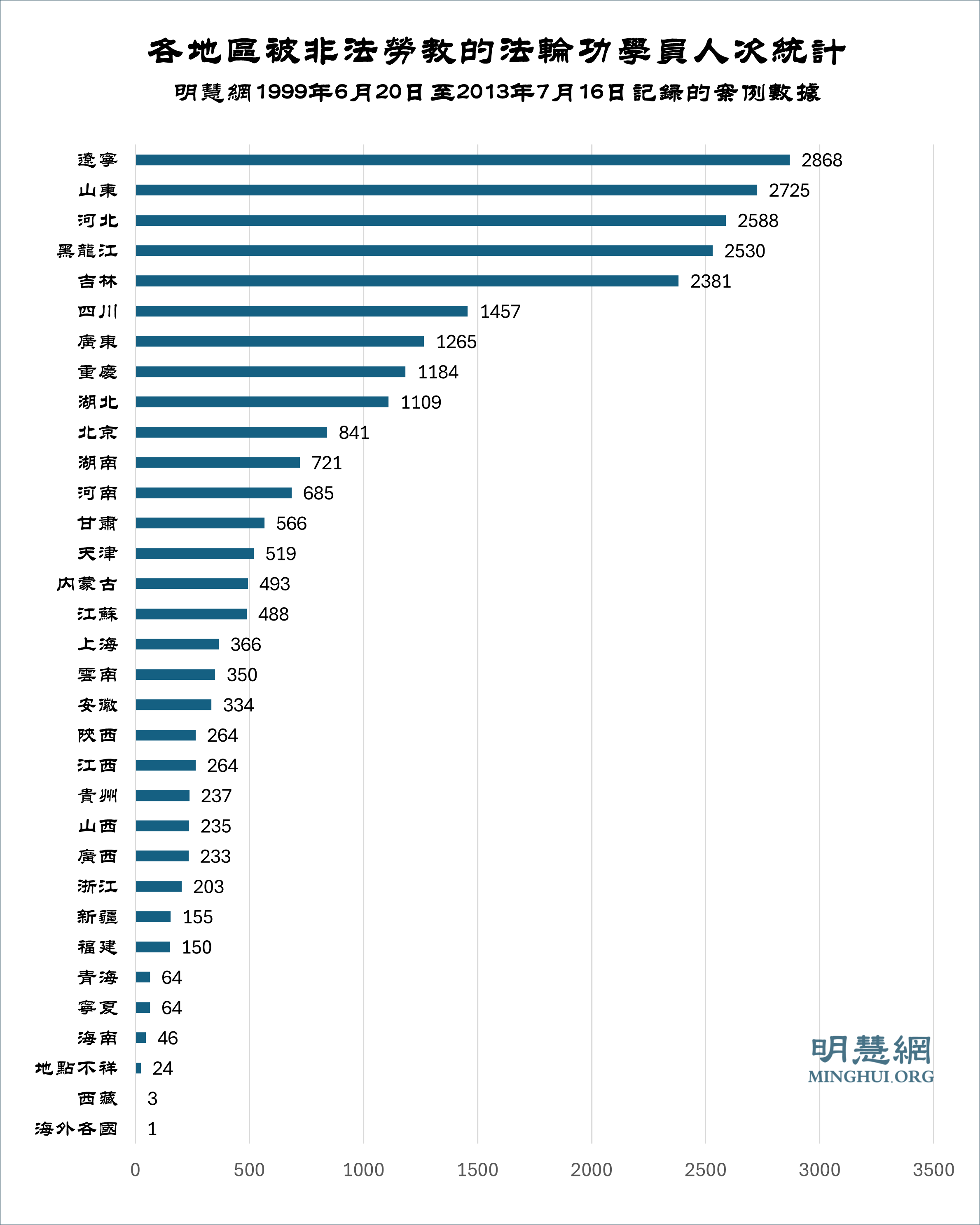 八、26年各地区被非法劳教的法轮功学员人次统计(未报道出来的案例没有计入在内):