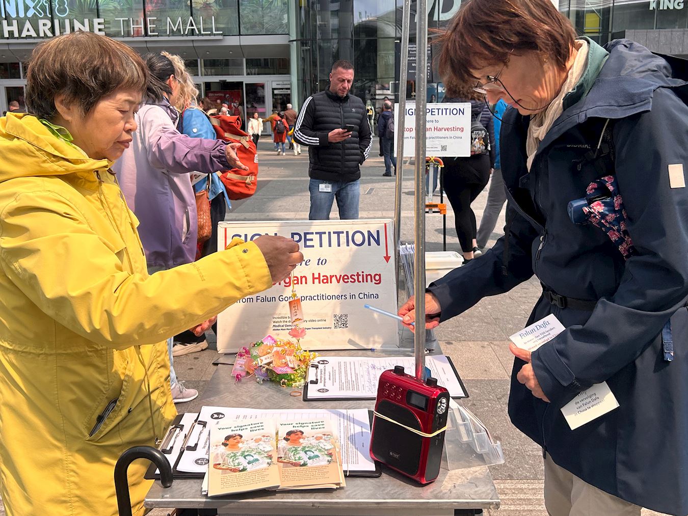 图13~14:来自比利时的语言教师伊尔瑟(Ilse)女士与女儿签名请愿,希望(迫害)能停下来。