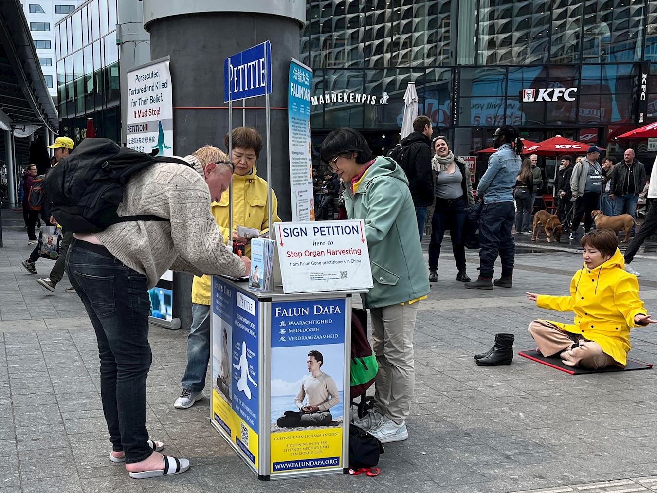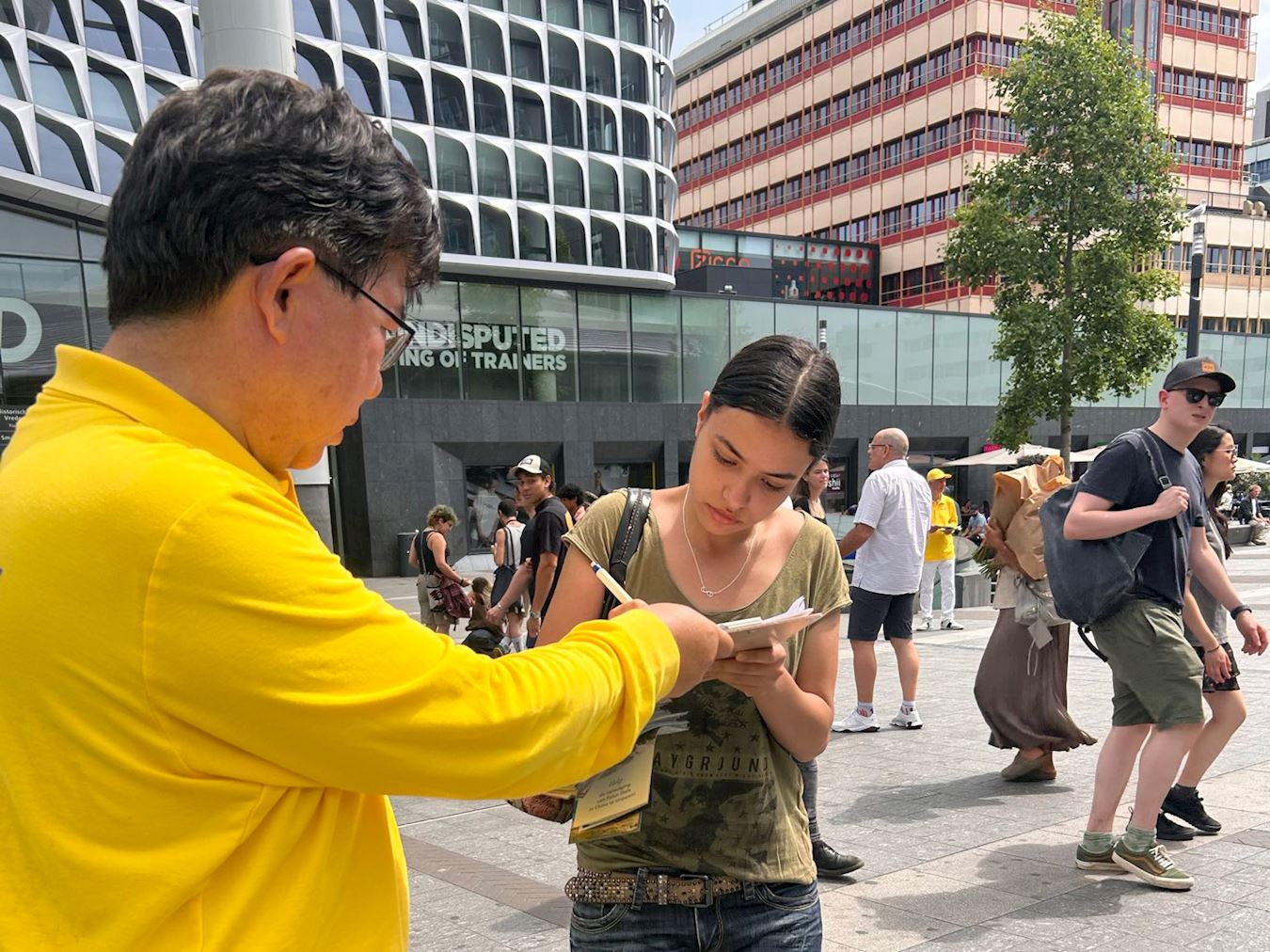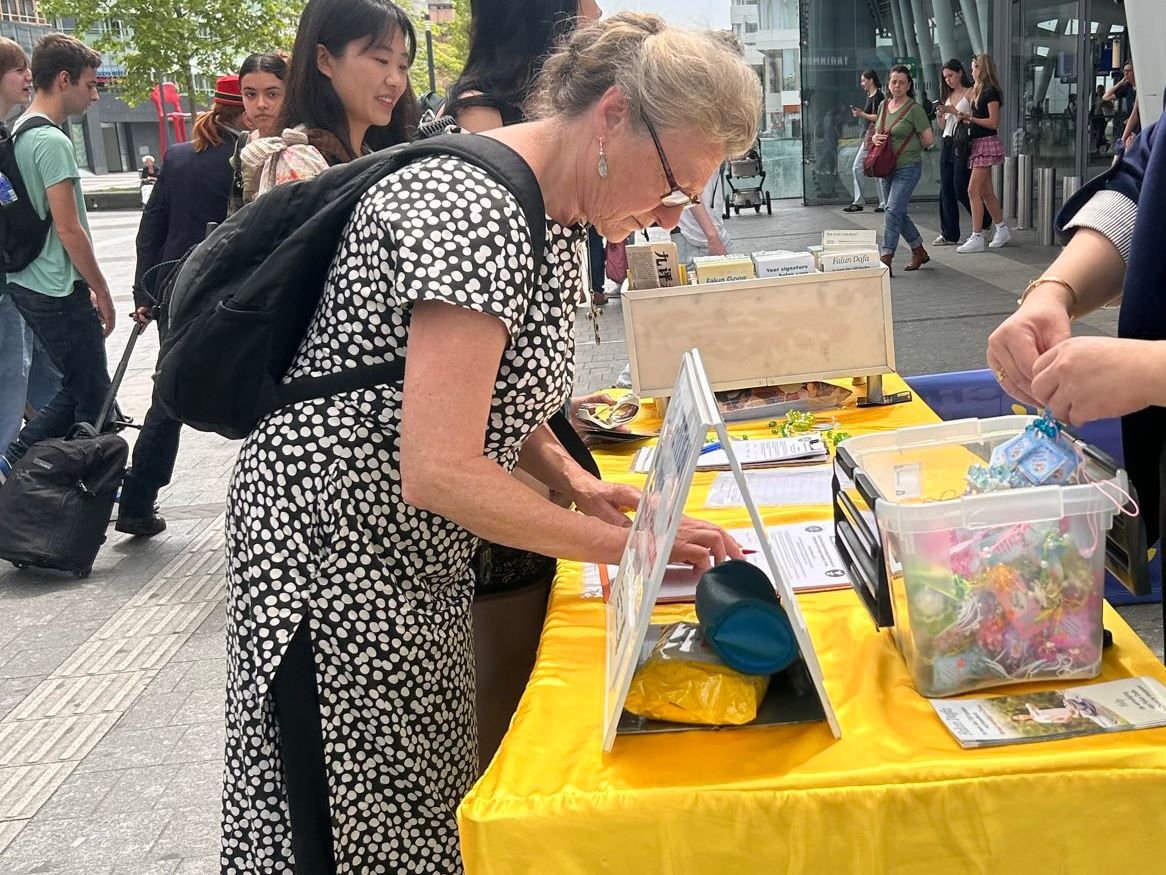 许多人停下脚步来了解法轮大法,他们被真、善、忍的信息所感动,并对法轮大法的普世价值和法轮功学员和平理性的反迫害方式表示钦佩,许多人主动在请愿书上签名,表达对法轮功的支持。