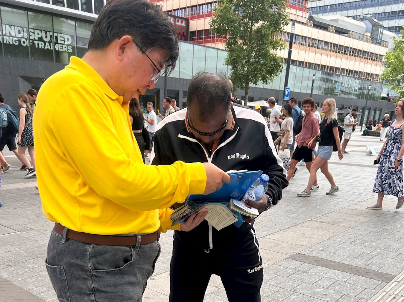 两名年轻男士与学员一起炼了第二套功法“法轮桩法”,他们希望能够为学员提供帮助,早日让迫害停止。两人都签署了请愿书,其中一位说:“我爱你们做的事情!”