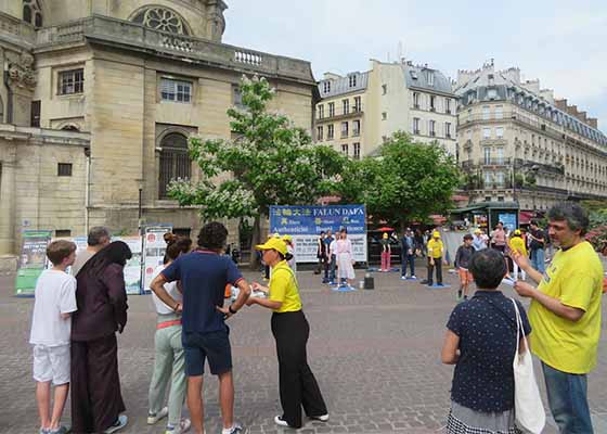 巴黎法轮功学员5月31日在夏特莱街区向人们介绍法轮功,并揭露中共对法轮功学员的迫害。明真相的游人民众纷纷在反迫害征签表上签名。