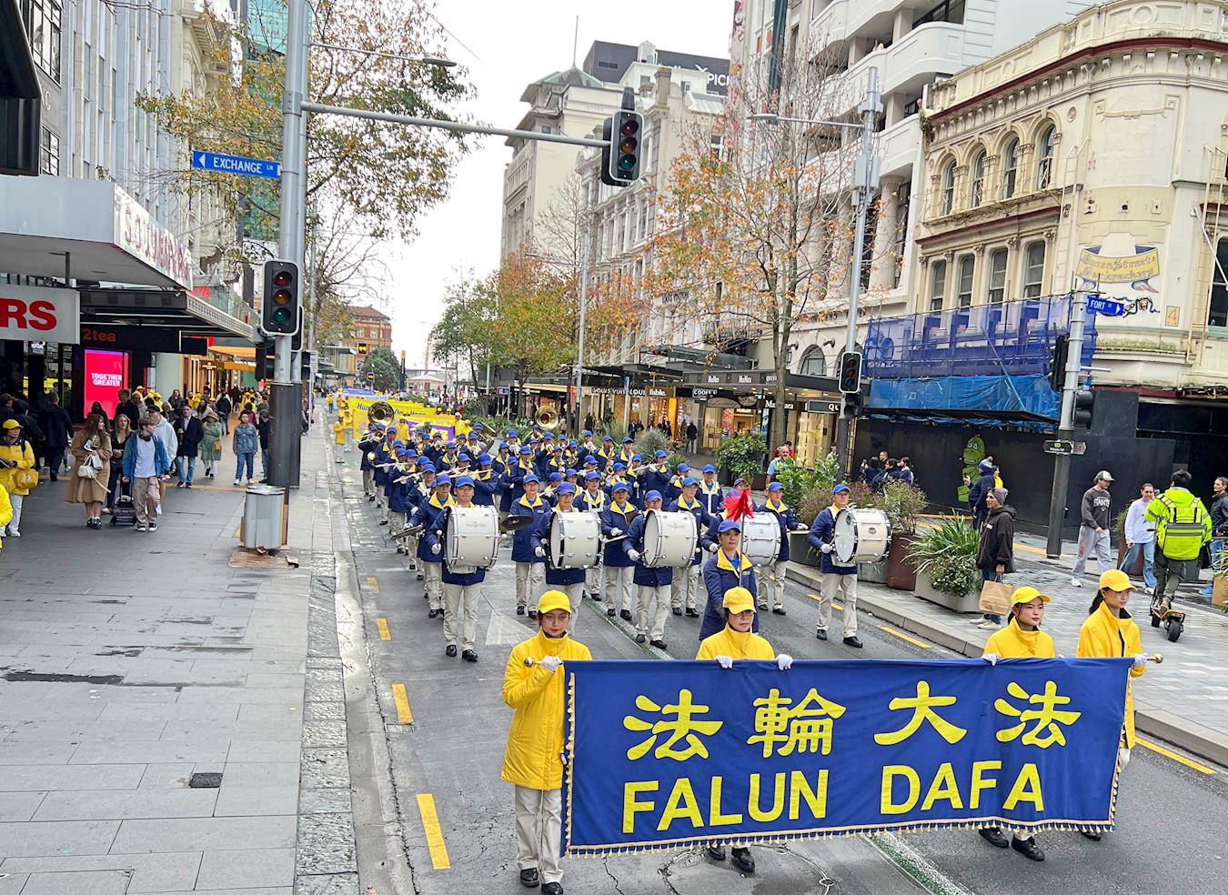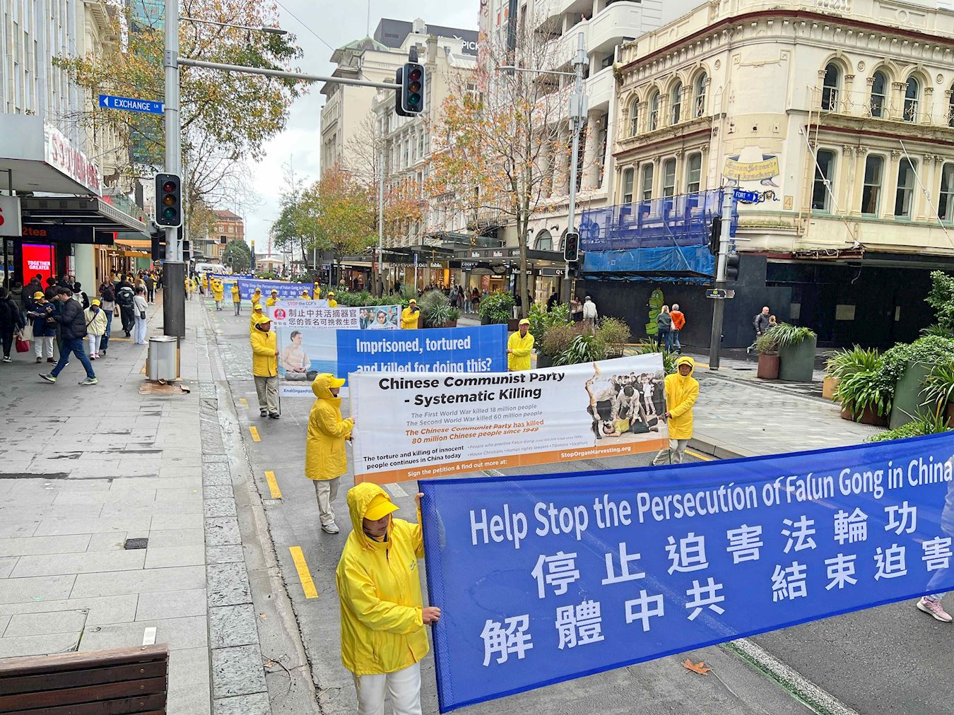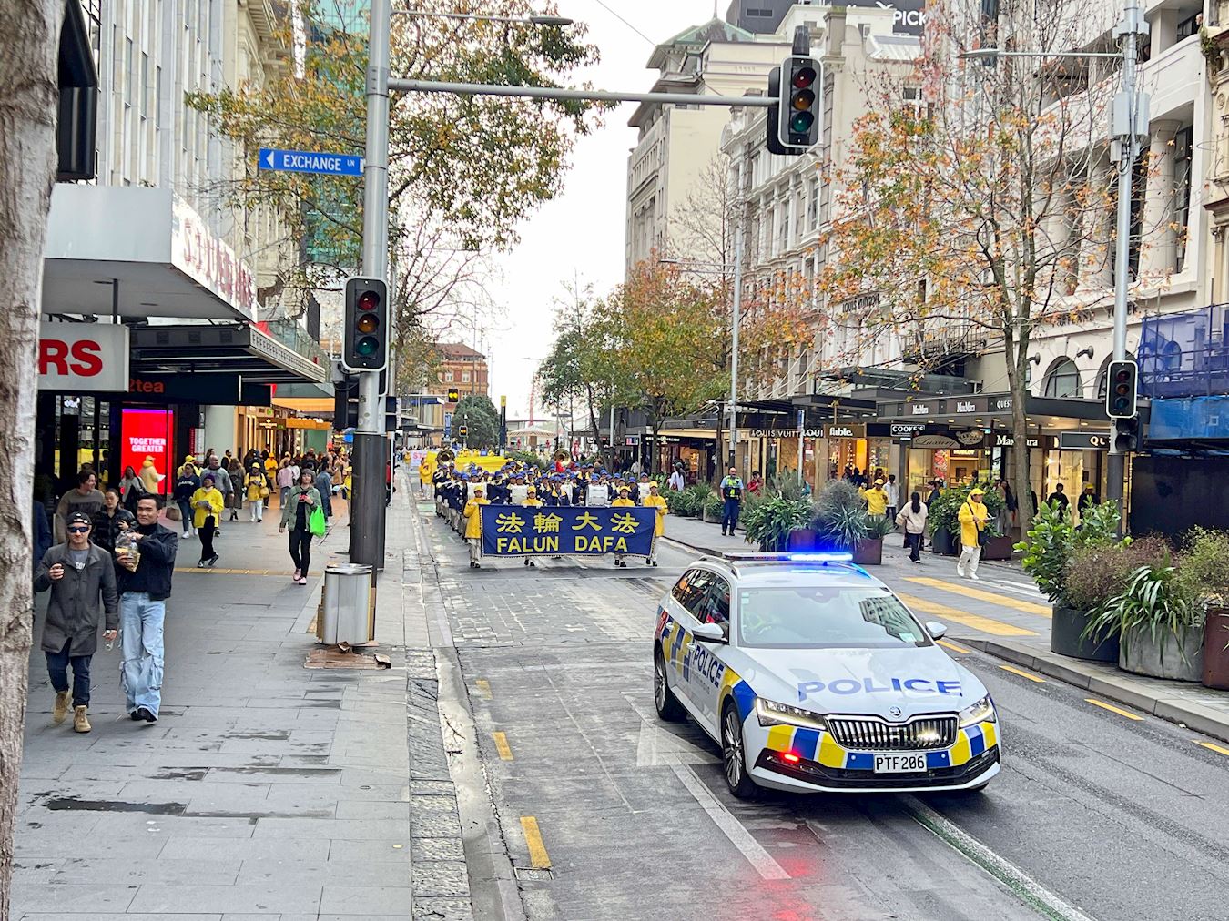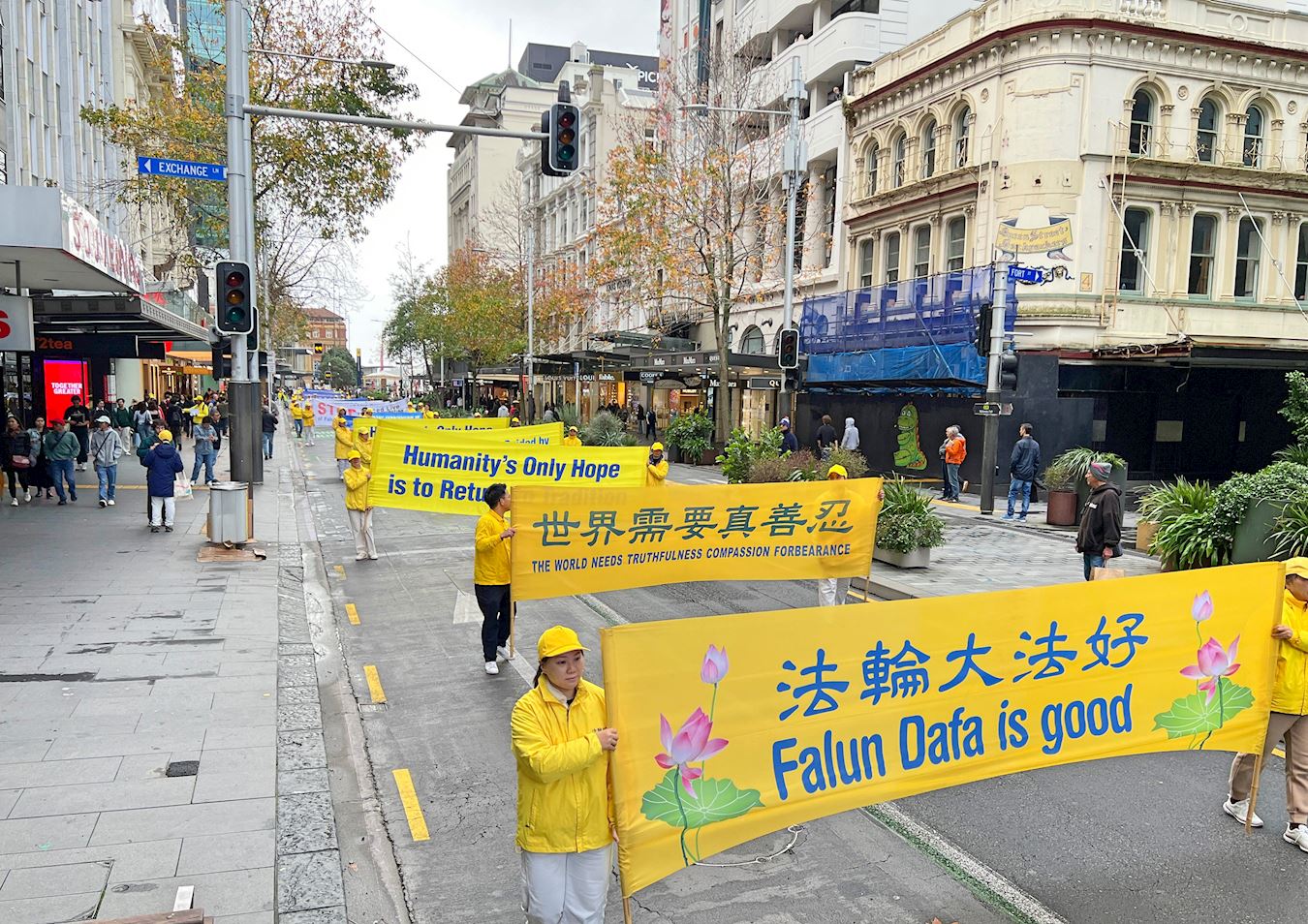 '图1~5:二零二五年六月二十八日,新西兰法轮功学员在奥克兰市中心皇后街游行,反对中共的迫害和酷刑。'