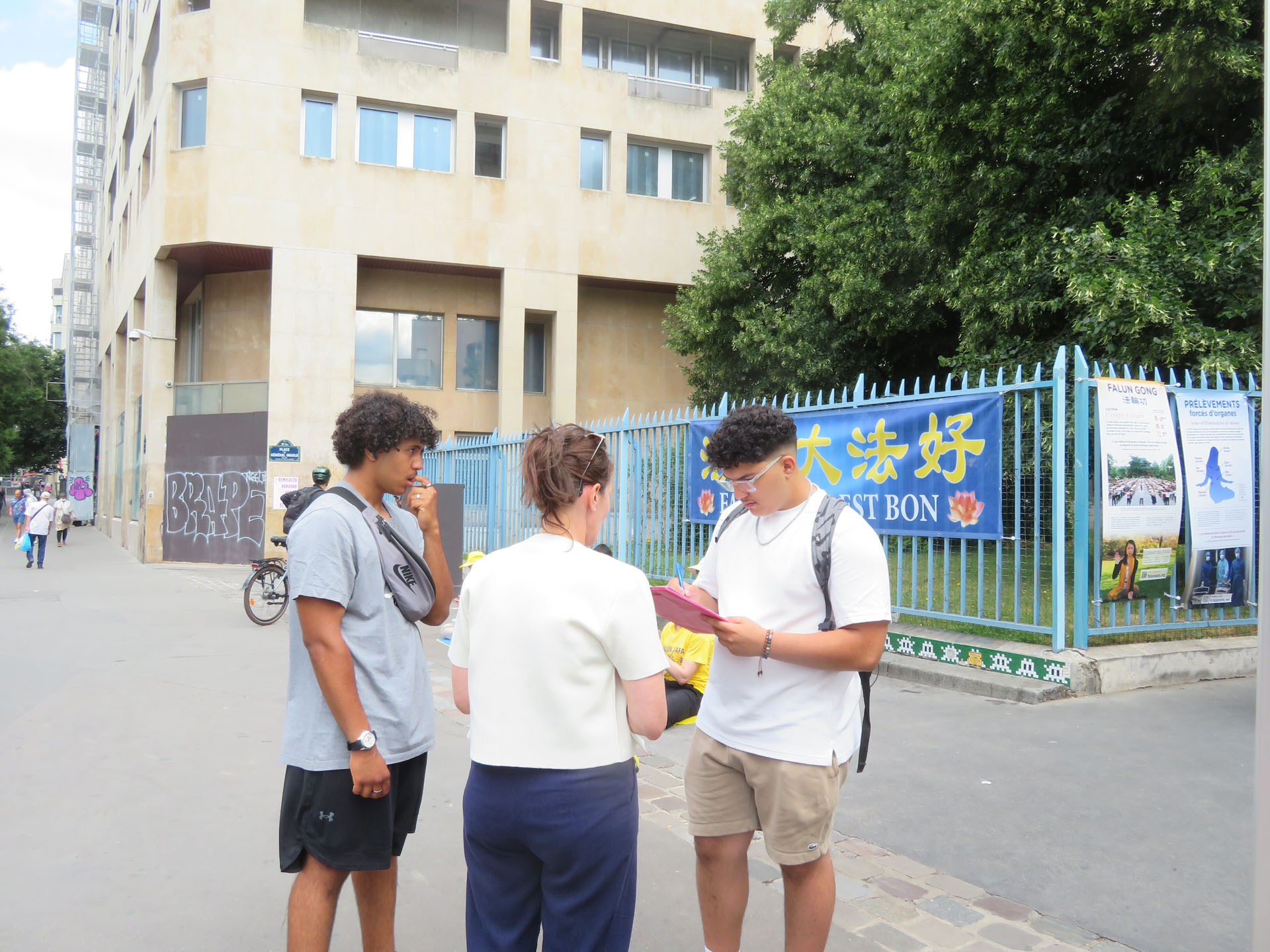 贝努瓦·安德雷(Benoit André)和迪伦·林(Dylan Lam)是高中生。在拉德芳斯的真相展位前,了解真相后,他们不理解中共对法轮功的迫害,贝努瓦说:“如果这能帮助人们变得更好,为什么要禁止呢?”“因为人们只是想要变得更好,却因为政府的害怕而受到迫害,这太可怕了。”